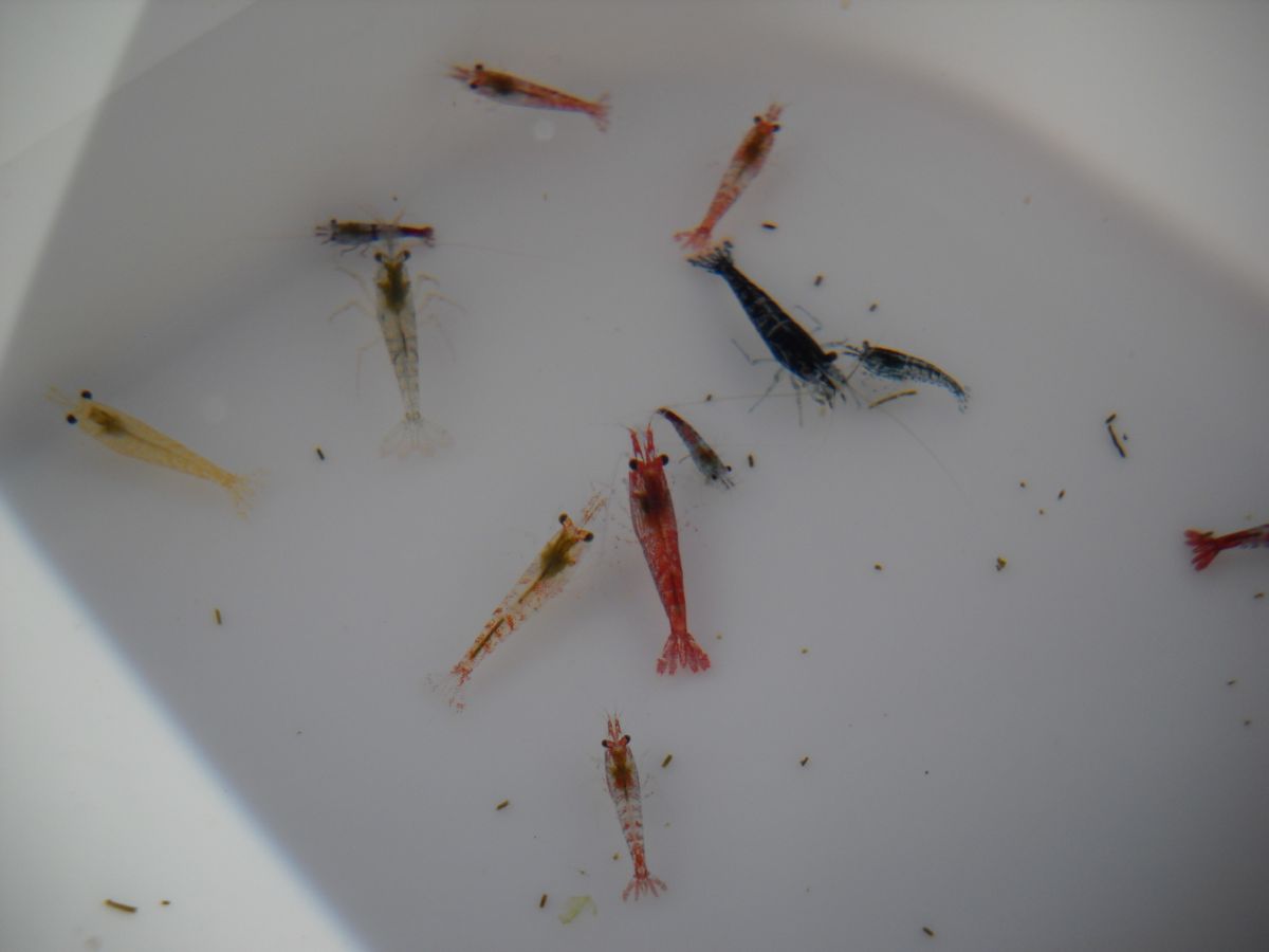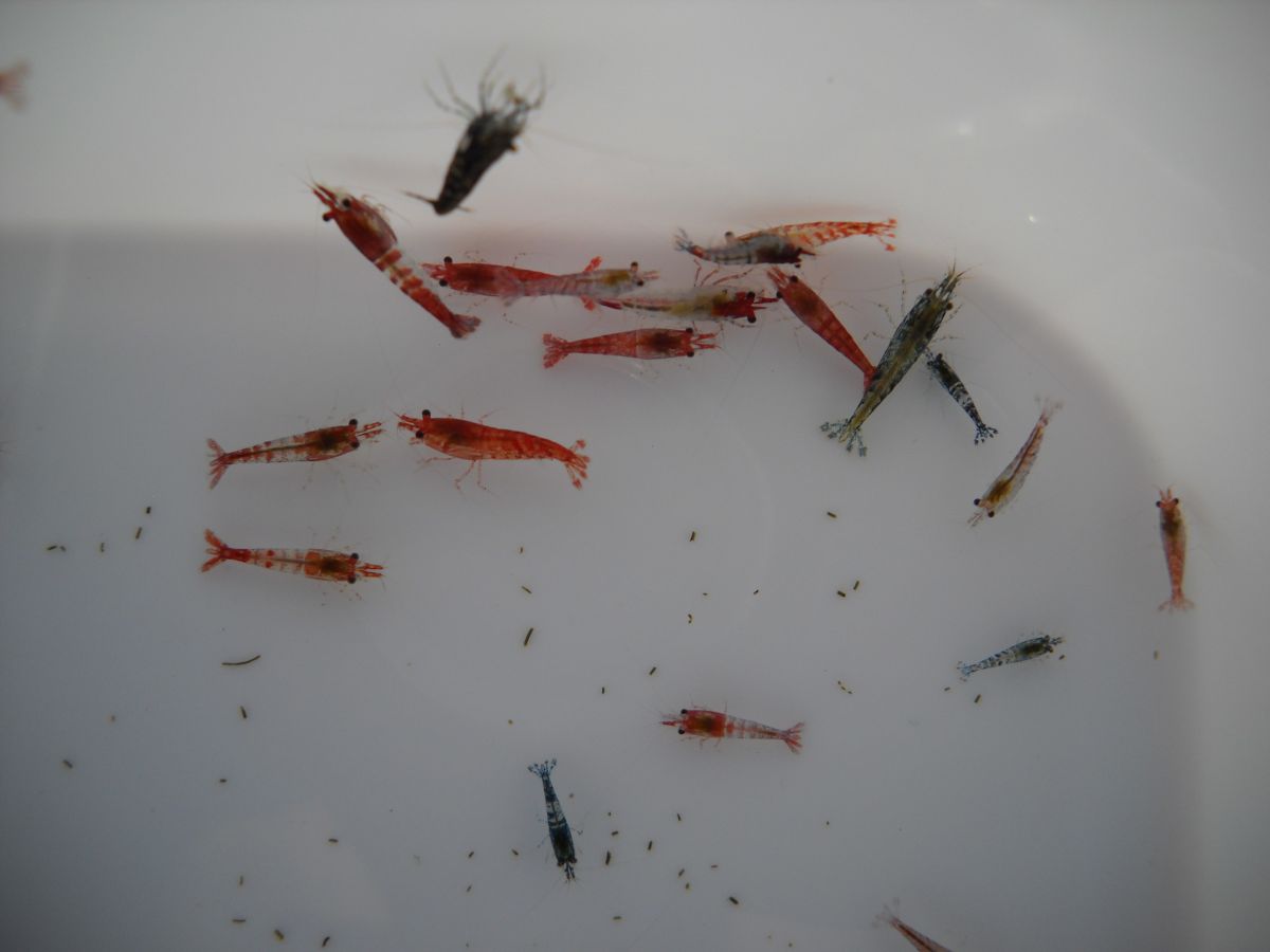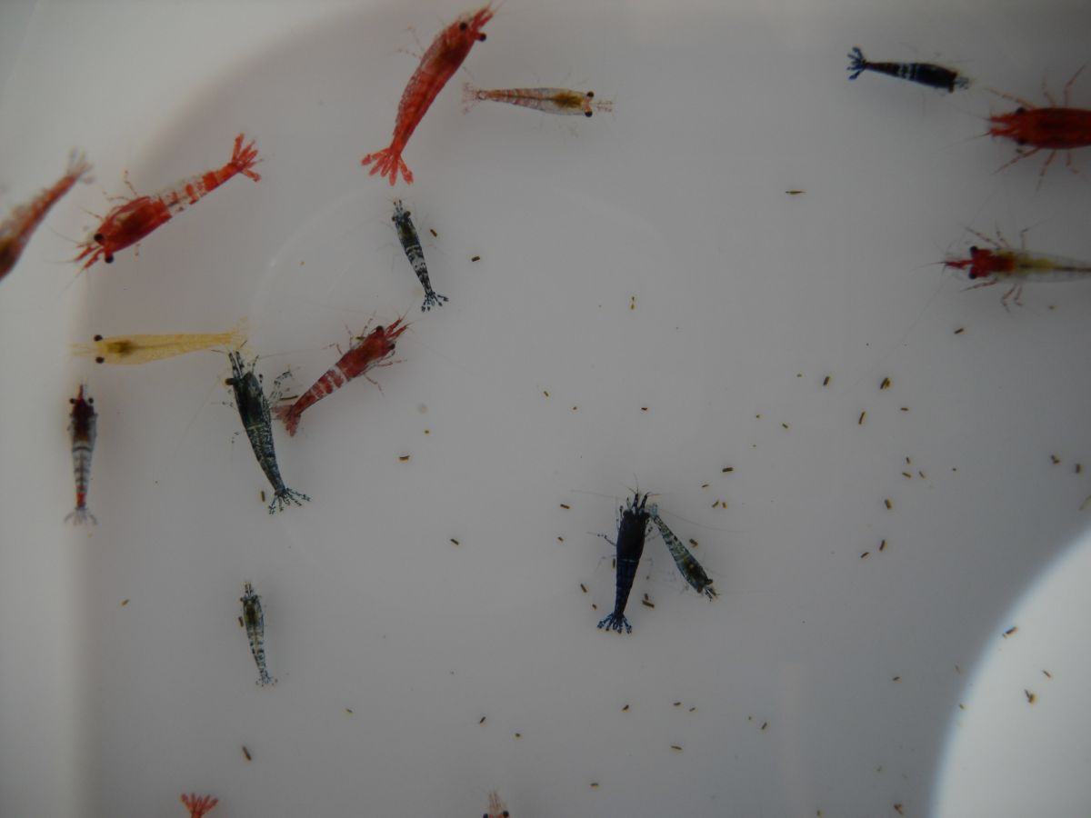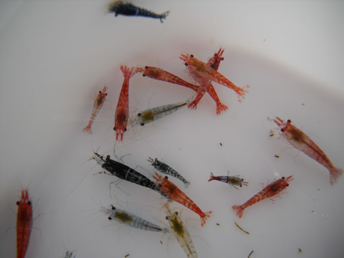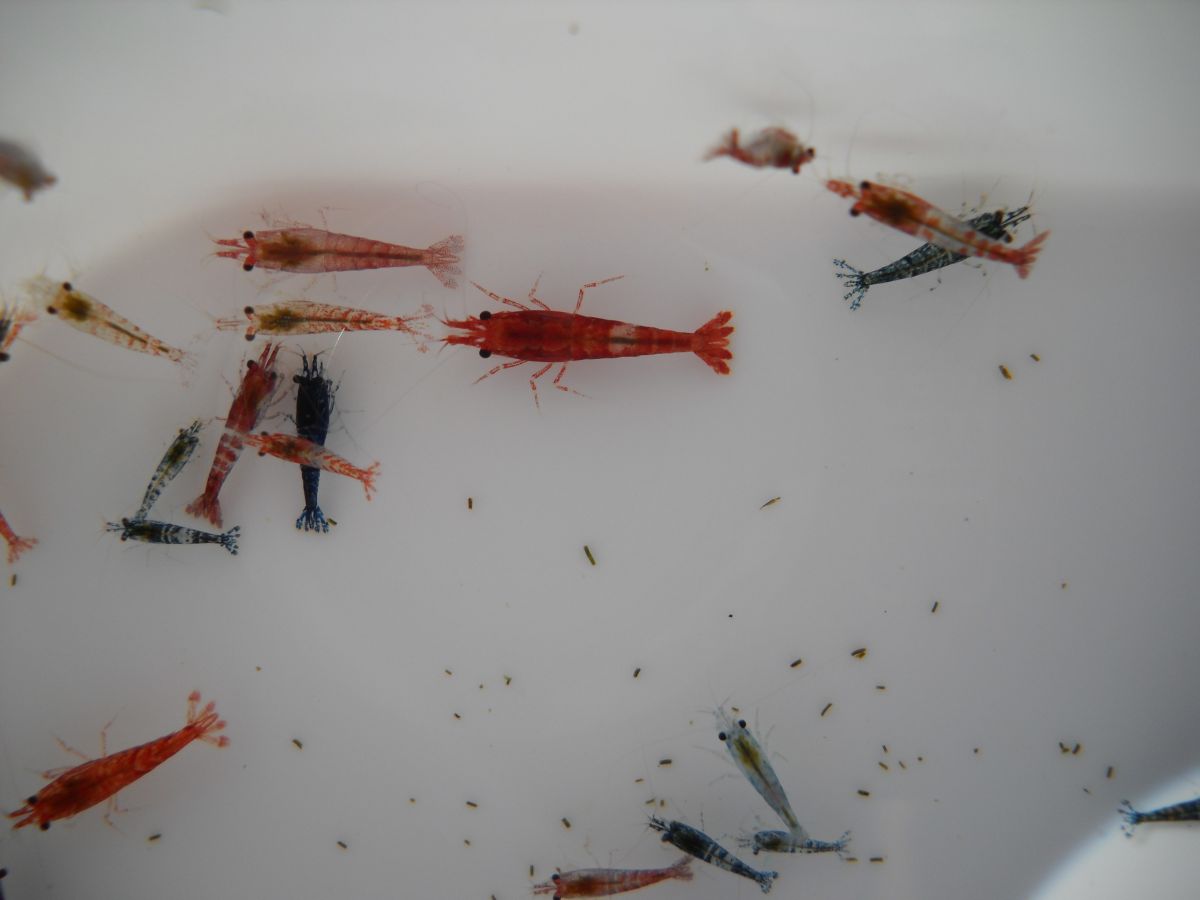 Размеры - около 1 см. Основная массы - это отбраковка красной Рили (Neocaridina red Sp. Rili), Рили Карбон (Neocaridina Carbon Rilli).