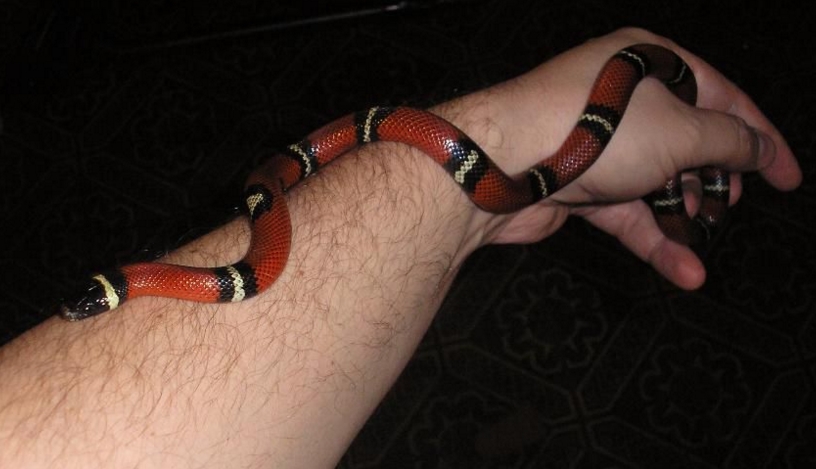 Молочная змея Lampropeltis triangulum sinaloe. Крупный подросток (примерно 60 см) своего разведения. Отлично ест как живой так и размороженный корм. Без определения пола.