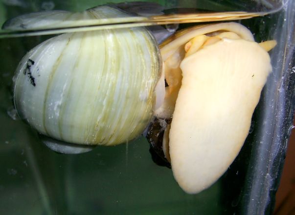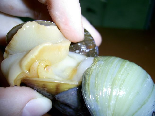 Делается это так: берется ампуляха за панцирь и поворачивается к нам подложкой (или дверцей раковины скорее, т.к. она уже спрятаться успела) головой вверх. Ждем, ампуляра открывает крышку и вылазит. Слева (как смотрим) нужно рассмотреть в мантии некий отросток (не путать с трубкой для воздуха, которая справа и с усиками ). Рассмотрели??? Поздравляю, у вас мальчишка.