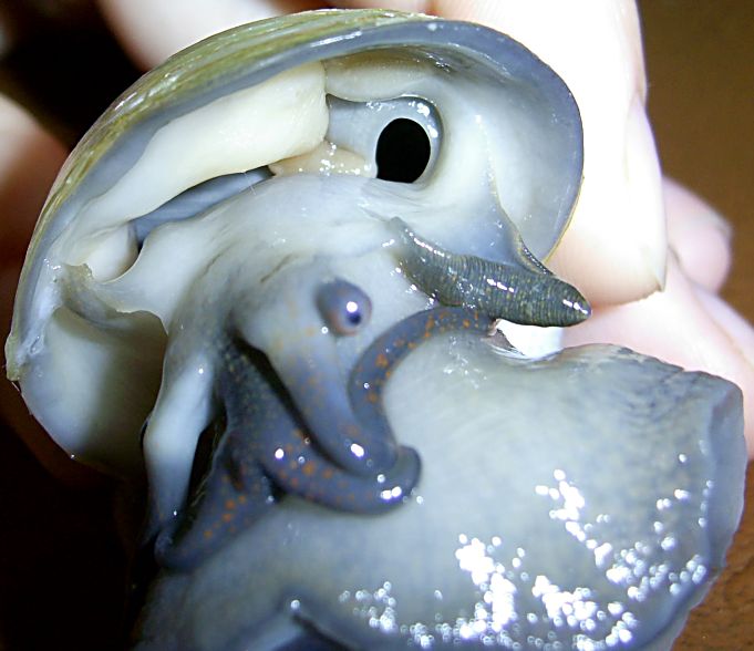 Второй вариант - дождаться пока она вылезет подышать. Очень большая вероятность что во время этого процесса раковина запрокинется назад и Вы рассмотрите всё что хотели.