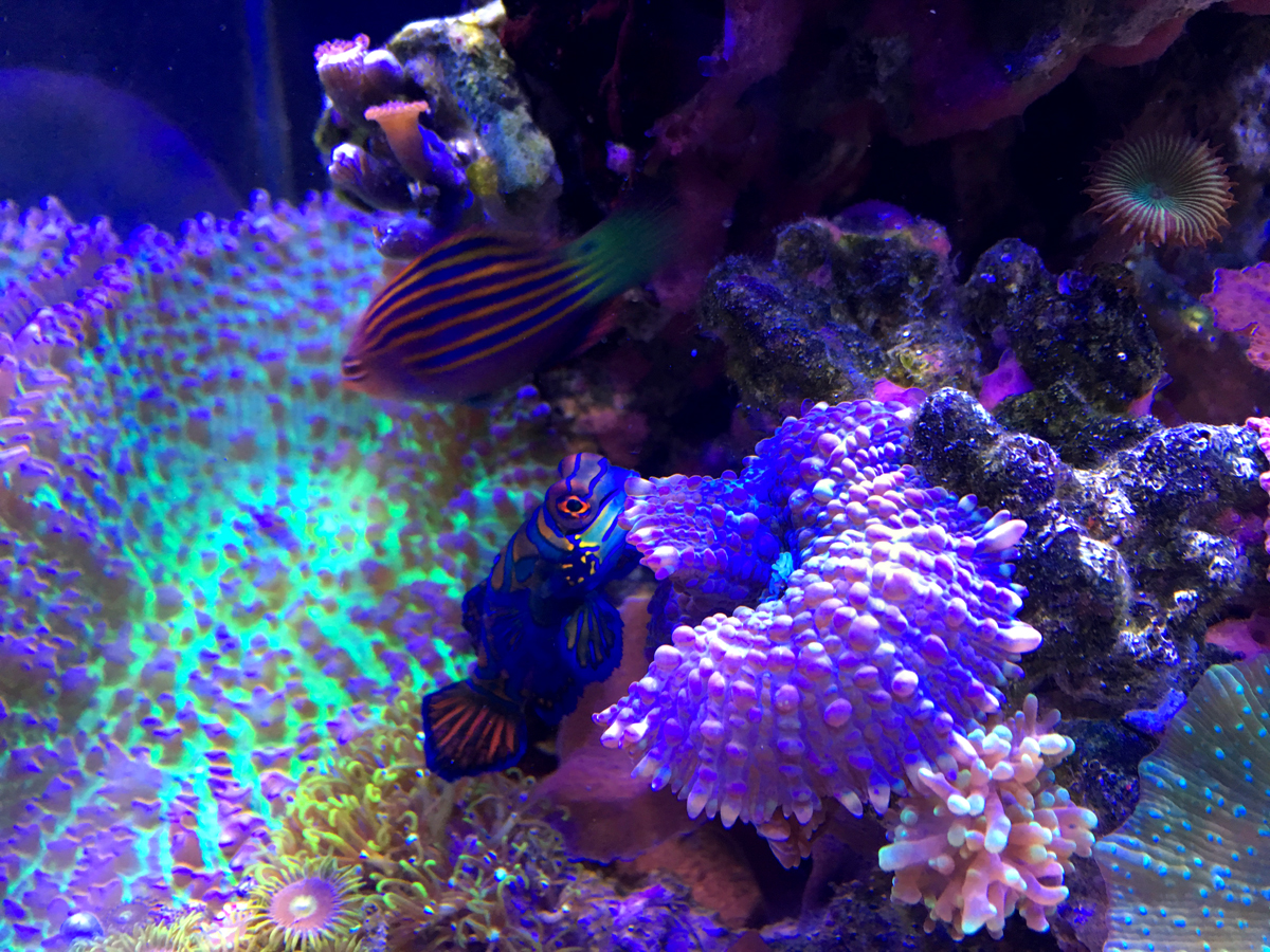 Из рыб в банке; два оцеляриса, губан пижама, псевдохромис фридмана, хризептера желтобрюхая и любимец мандарин. Актиния пузырек (стало две) и звезда фромия.