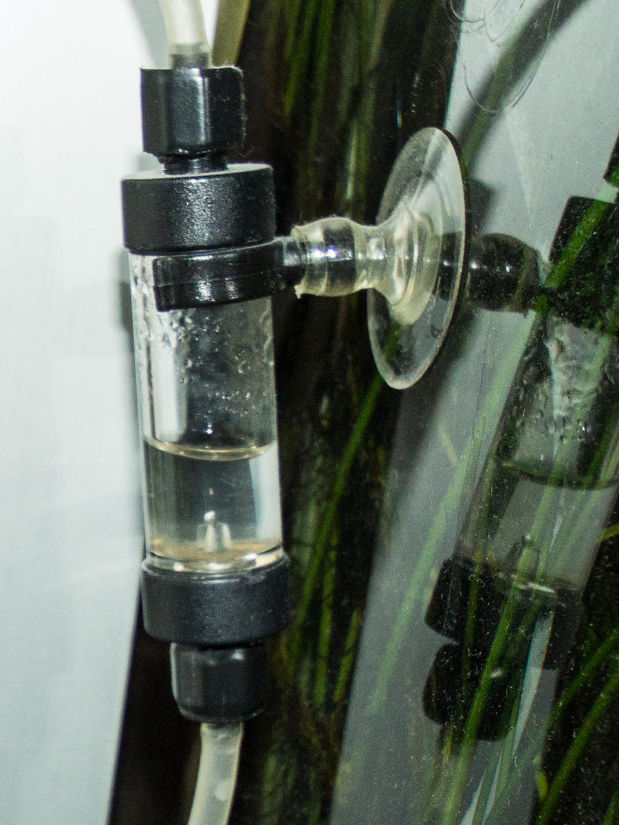 СО2 балон з арматурою Camozzi. CО2 подається з 7:00 до 21:00, насиченість СО2 у воді контролюється дропчекером, інтенсивність подачі - лічильником бульбашок. Розпилення СО2 через 4 гілочки бузини під'єднані через розгалужувач (на фото).