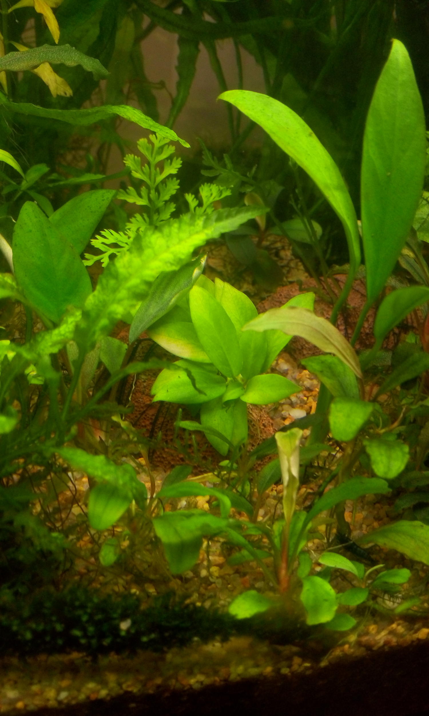 Попал такой ко мне под названием:Anubias barteri var. nana ‘Bonsai’ узколистный, долгое время рос потихоньку в тени эхинодорусов, потом был пересажен в другой аквариум с мягкой водой и нормальным светом и стал вариегатным:
