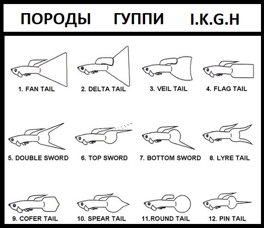 Эта организация признает 12 пород и на выставках этой организации действуют 12 стандартов гуппи(См.фото1) . В каждой из этих 12 пород , могут быть цветовые варитеты (См.фото2) . Вы , как и многие другие , на бытовом уровне привыкли считать цветовые варитеты - породами . Порода гуппи - это геометрия сложения корпуса и плавников . Две ,три и более породы гуппи , могут быть в одном варитете окраса . Эта система работает во всех породах всех видов живого - кролики , собаки , кошки , лошади , куры , волнистые попугайчики и т.д. и т.п. Например порода лошади орловский рысак , а окрасов(цветовых варитетов ) много - гнедые , каурые , в яблоках и т.д. Или стандарт и порода дог одна , а окрасов много -тигровый . плащевой , мраморный и т.д Например гуппи стандартов(пород) триангель и веерохвостые могут быть в варитетах окраса - москва , чернокорпусные и т.д.