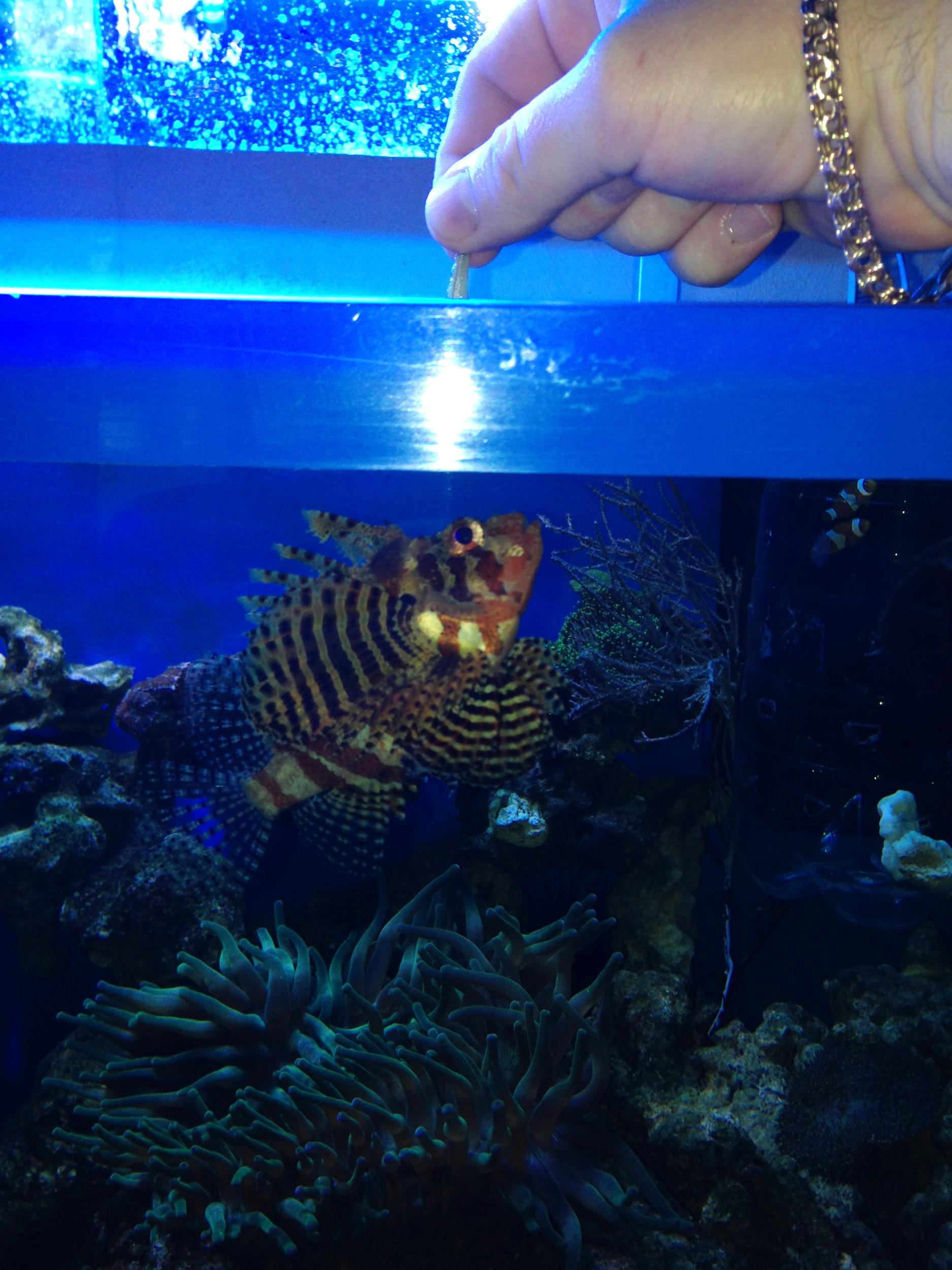 Продам Dendrochirus brachypterus (Крылатка карликовая), в акве около 3-х месяцев, размер 9-10см., полностью переведена на искусственный корм (сердца, кальмар, атеринка), что приводится в движение при помощи пинцета, у меня уже ест с руки (см. фото). В акве с ней живут Chrysiptera hemicyanea (Хризиптера желто-синяя) и Pseudocheilinus hexataenia (Губан шестиполосый). Практически постоянно находится на виду.