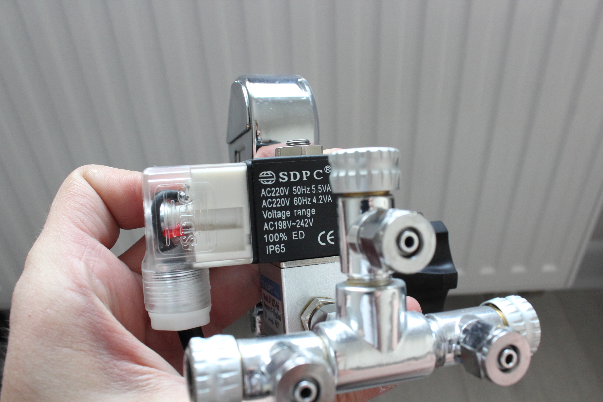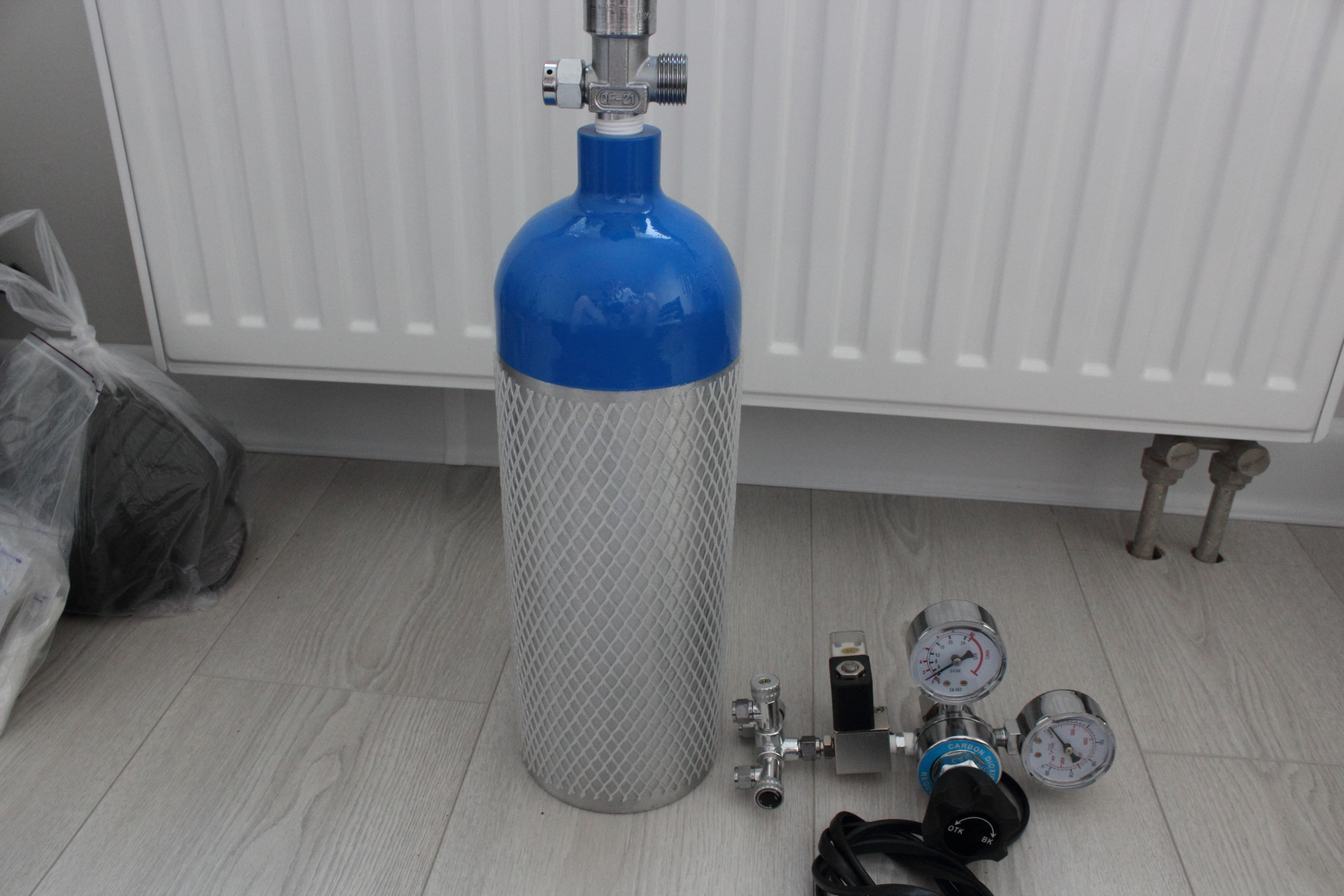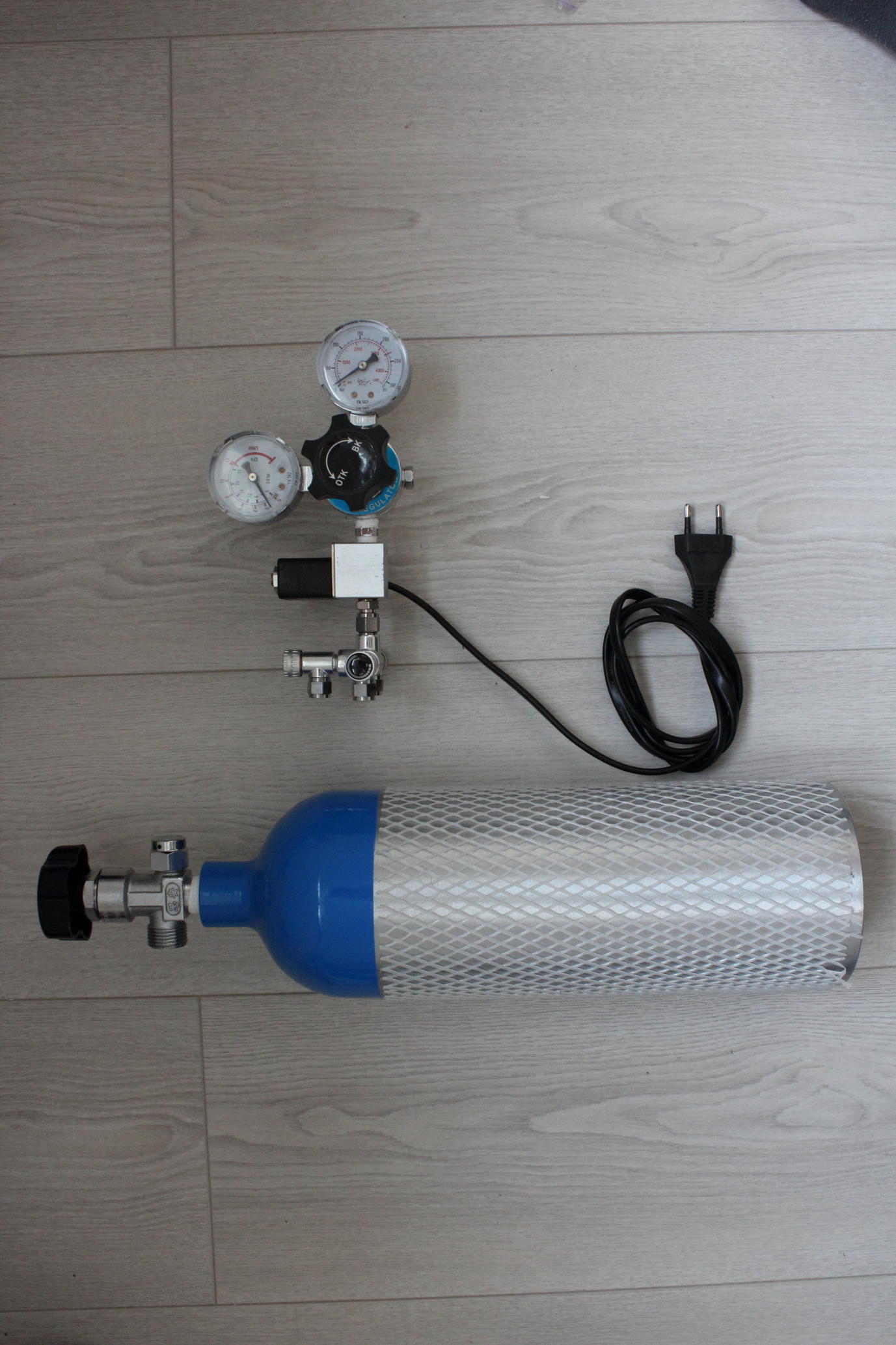 Двухлитровый алюминевый плоскодонный(!) балон (заправка на 1,2-1,4л), на три выхода, электромагнитный клапан.