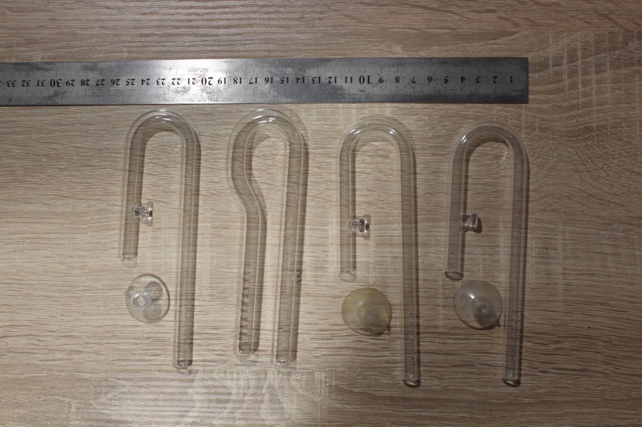 Несколько стеклянных трубок для фильтров, "в стиле ADA" разных форм: несколько "обычной" формы (одна с меньшей радиусностью, две- с большей), и одна формы, которая предполагает крепление без присосок. Все - брендированнный китай, т.е. качество на довольно высоком уровне, сравнимо (я б даже сказал не проигрывает) с лидерами рынка.