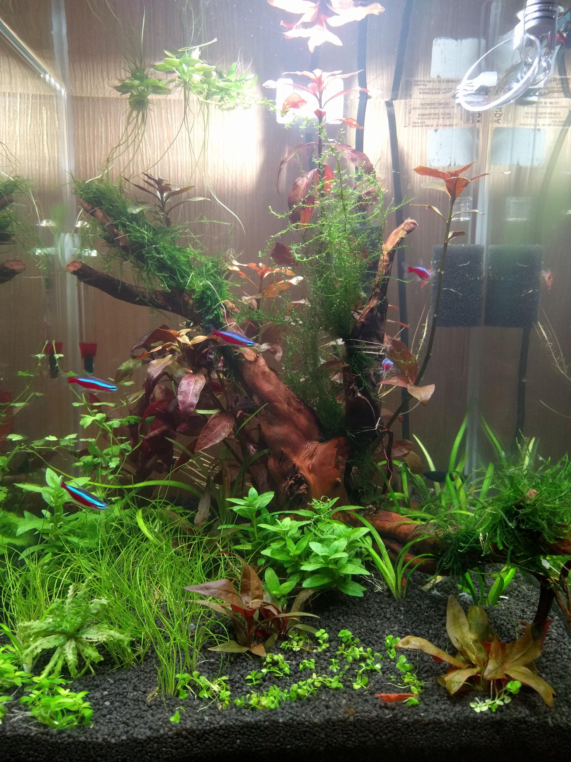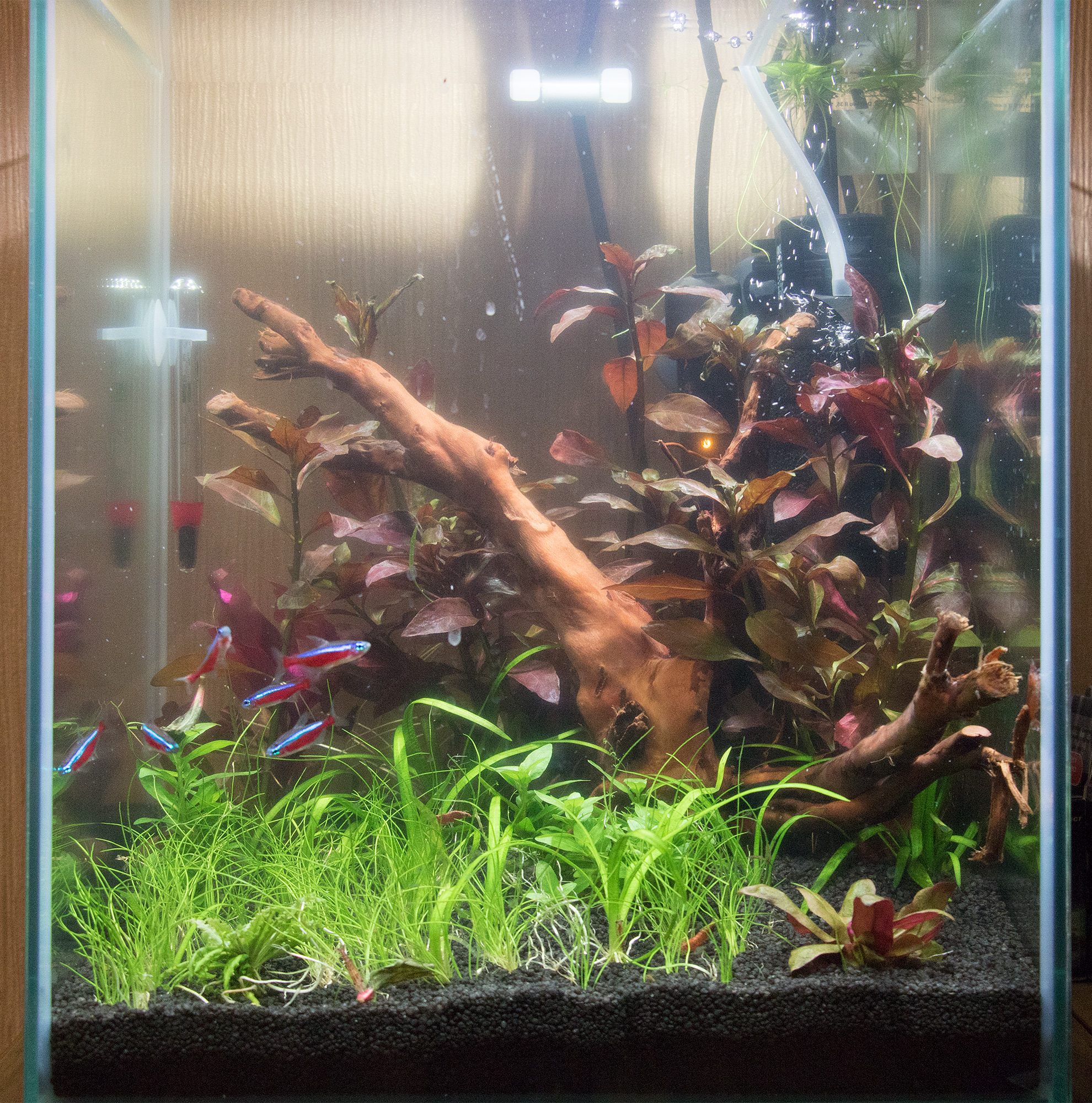 Запустил все это добро в субботу. Все красиво и нравится, как для первого дня. Вечером выключил свет. Утром вода мутная, рыбы на поверхности, три креветки трупики (выловил - похоронил). Вспомнил, что не надел на фильтр трубку аэрации, видимо ночью растения задавили живность CO2. Утром поставил трубочку - начал аэрировать. Через полчаса рыбки и креветки пошли в толщу воды и на дно, видимо получили кислород.