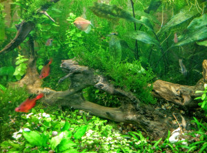 Коряга — корень ивы, росла у водоема,* не всплывает, воду не красит, рыбы не болеют. Стоит в аквариуме месяц.* Мох пламя (Flame moss) привязан к коряге леской. Рос без УДО и СО2.