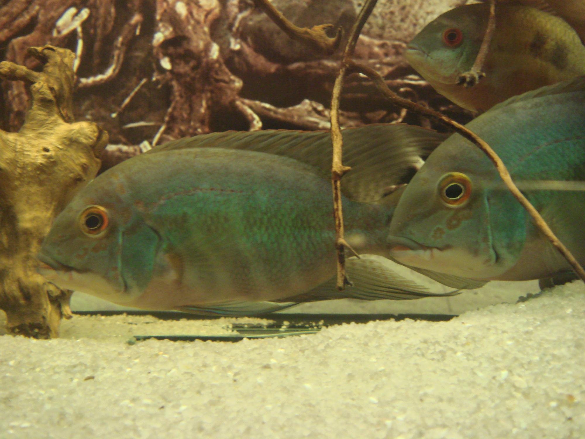 Ещё несколько снимков похуже. На втором виден экземпляр поменьше (~17см), но его не обижают! Хотя его в общий аквас я подсадил гораздо позже - гонений не было! Вообще книга пишет, что у пситакусов сильная внутривидовая агрессия. Могу сказать, это справедливо лишь поначалу - пока не устаканятся отношения. А вообще поведение больше схоже на цихлозом, нежели на собратьев с амазонки.