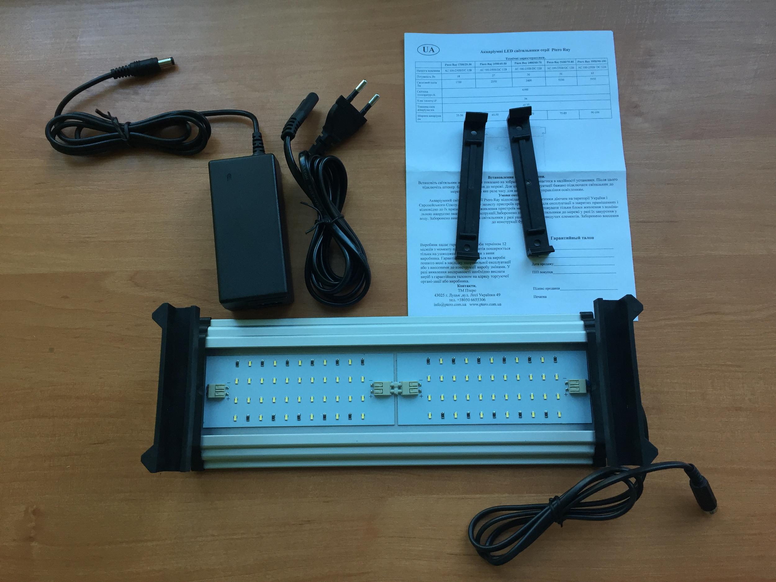 Я получил для апробации самый маленький экземпляр из всей линейки светильников. Упакован в обычную компактную картонную коробку... комплектацию светильника можно увидеть на фото - это собственно сам светильник, блок питания со шнуром и две пластиковые пластинки... на сколько я понял они предназначены для крепления светильника под крышку аквариума