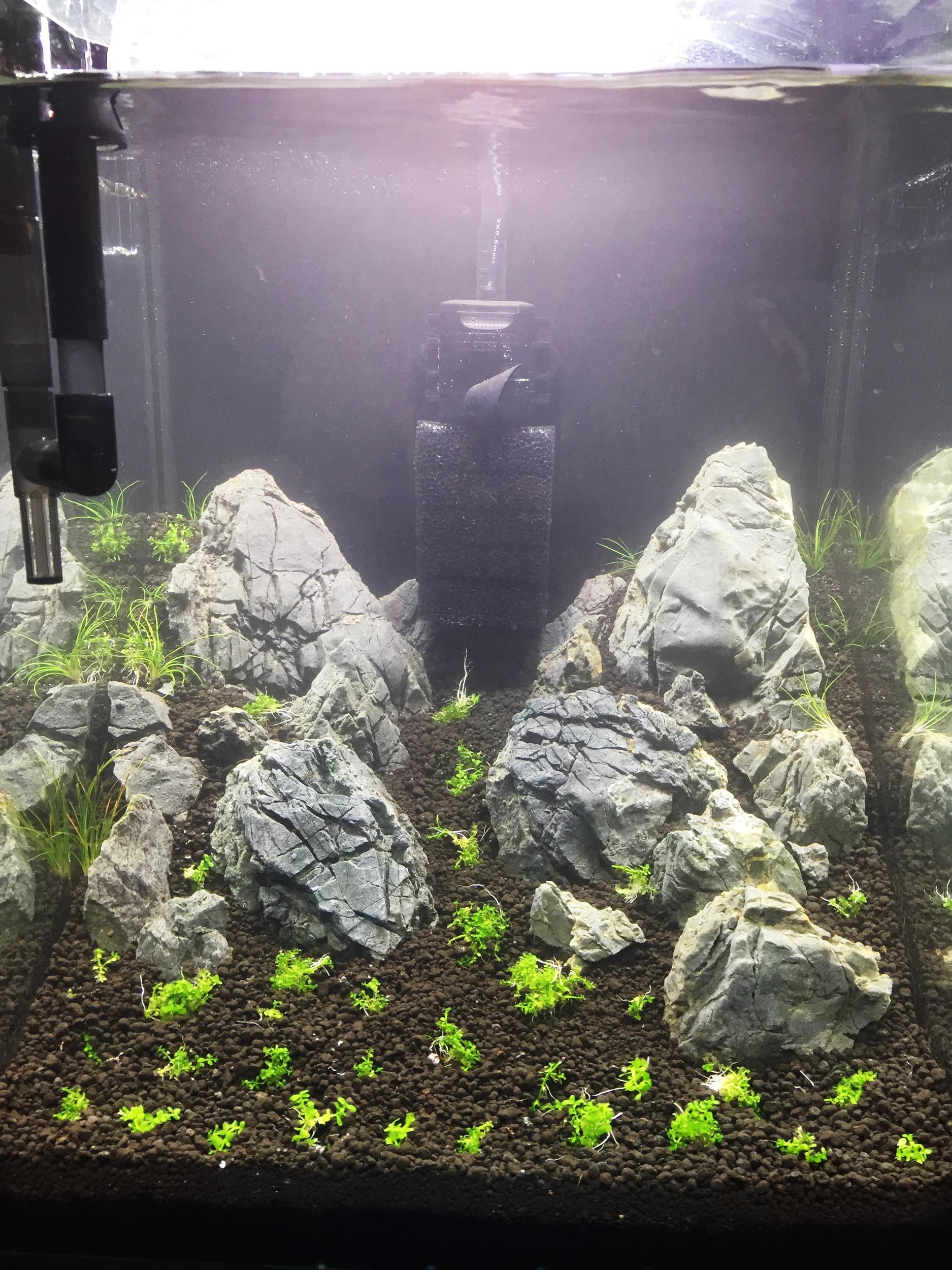 Сейчас конечно бардак, но месяц назад картинка была еще намного хуже... с моей вины  С самого начала, я не учел мощность светильника и начал светить по 8 часов в день и ежедневно лил удо, но без подачи СО2. Как результат схлопотал вспышку зеленых. Особенно пострадали камни, которые по цвету ничем не отличались от травы, а потому весь аквариум был на вид как болото
