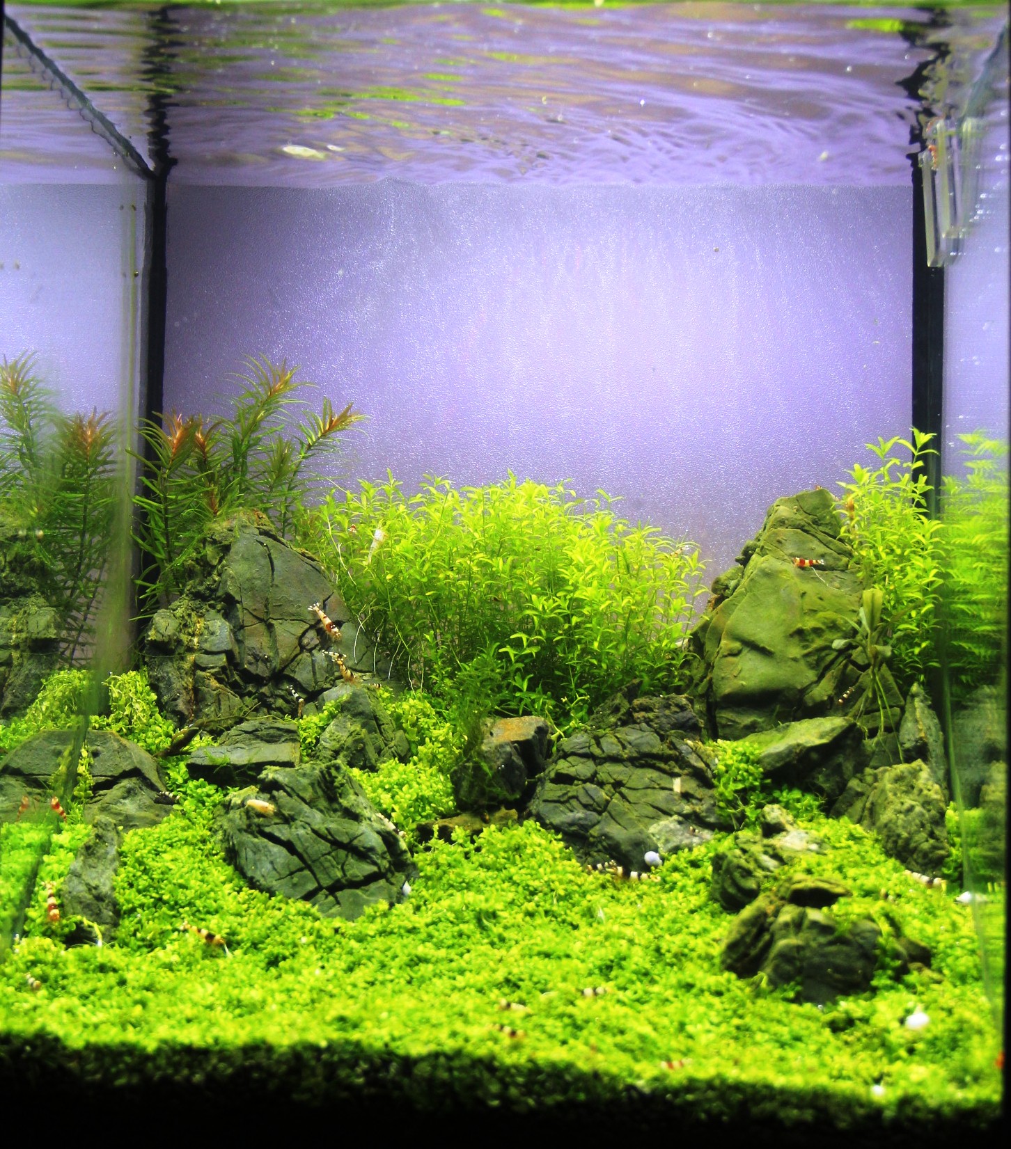 Я решил поэкспериментировать, поставил лимонку для подачи со2 через веточку рябины, но при этом из удо стал лить только монофосфат и микро по 0,5мл/день, а световой день сделал с 10 до 13 и с 17 до 21. Из живности были запущены 10 креветок и 10 тедиков.