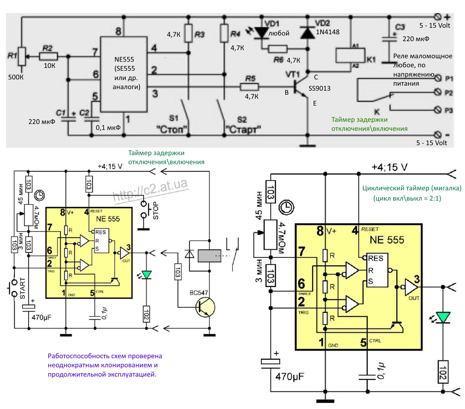 Как уже указывалось, схема древняя (как и таймер на котором она собрана) и поэтому простая - аналоговая - без модных цифровых веяний (ну там - экранчик с цветочками, энкодер, МК, программа, прошивка и т.д.).