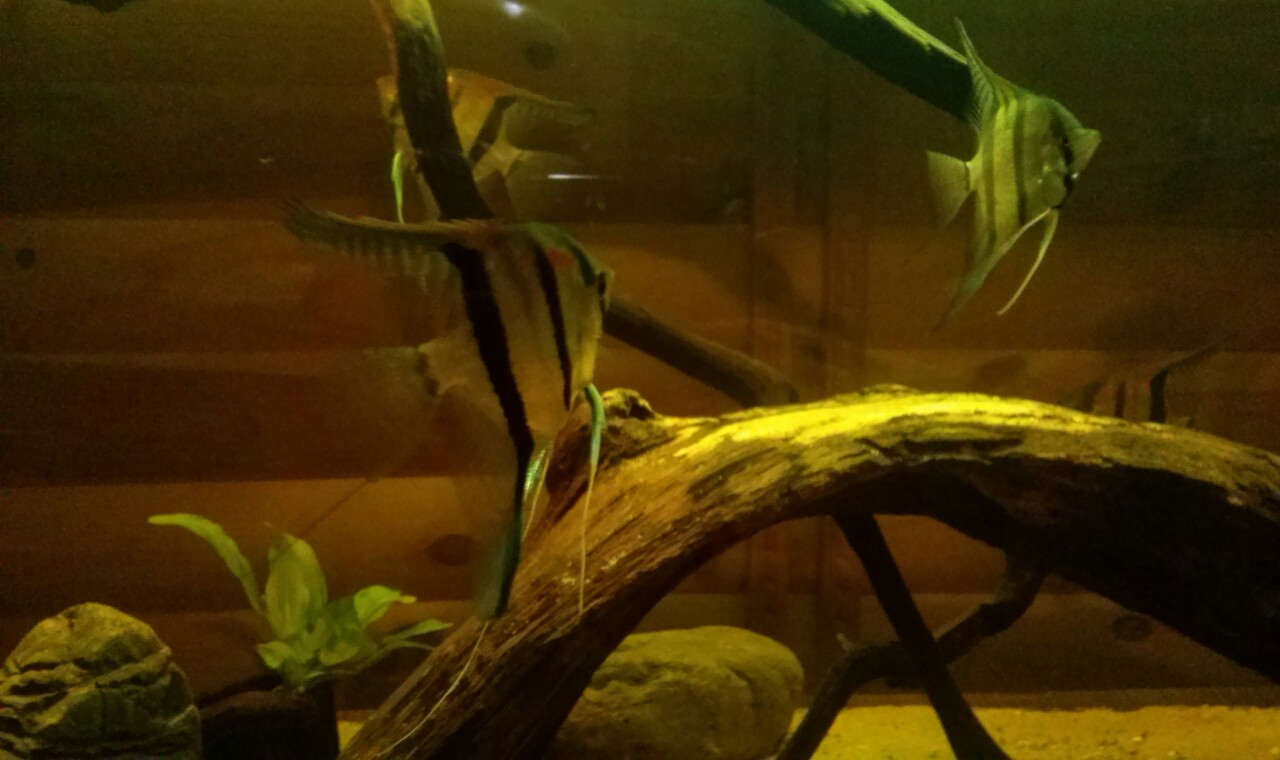 Через несколько часов у Санта Изабель проявилось оживление. До того они неспешно курсировали общей стаей. У некоторых особей под брюхом проявились семенники ( это были самцы) , ближе к вечеру их оживление перешло в более активную стадию. В левом углу аквариума сверху вниз опускаеться большая ветвистая коряга, а также в самом углу стоит высокая двупалая коряга. Вот там и началась суета. Агрессии не было, просто четыре Санты выгоняли с того угла всех в том числе и друг друга.