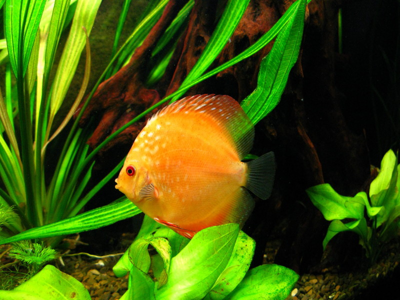 Вот переделал аквариум для дискусиков  . Вчера и сегодня запустил жильцов, семь штучек. Размеры где-то 7-8см у крупных, и где-то 4-5 у меньших. Вот первые фото