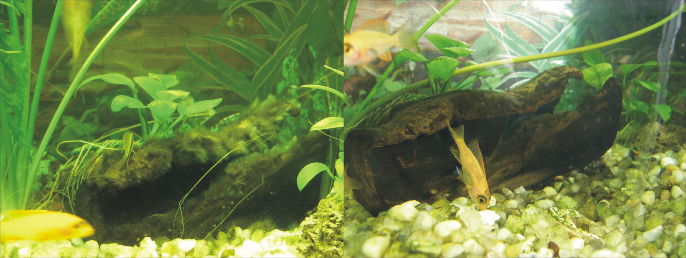 почти сразу после покупки SAE перешли на сухой корм, не брезговали и трубочником. а вот где-то через полгода подросли и, видимо, стали не успевать наедатся: опять "патрулируют" корягу и растения :-)