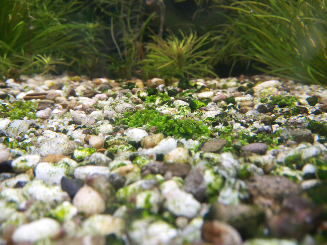 - Общее состояние аквариума не ахти видно по зеленению камней в грунте
