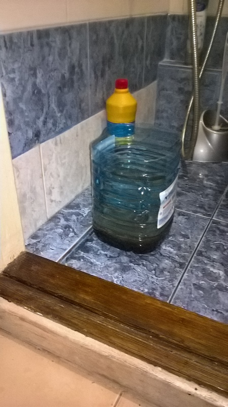Кончено, правильнее всего было бы просто подключить фильтр в ванной и пусть бы там работал. Но у меня он самодельный. И при всем том что его основные параметры очень даже приличные, мобильность к его достоинствам не относится. Поэтому я просто высыпал наполнитель в баклажку с набитыми дырками, слегка промыл его от основной грязи и поставил баклажку напротив выхлопа временного фильтра- для микроциркуляции воды в наполнителе.