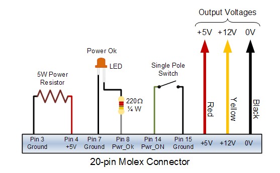 В наличии имеется блок питания от PC, ATX, благодаря родственнику, подарившему компьютер, который с успехом разошелся по-запчастям. От этого БП понадобится 12 В для питания светодиодной ленты. По информации сайта Electronics-Tutorial возможно использовать этот БП, с незначительными переделками.