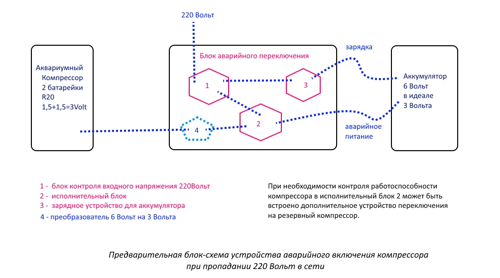 - для более продвинутых аквариумистов - компрессора на аккумуляторах 6 Вольт с функцией автоматического переключения питания (как на безперебойнике) и подзарядкой аккумулятора  .