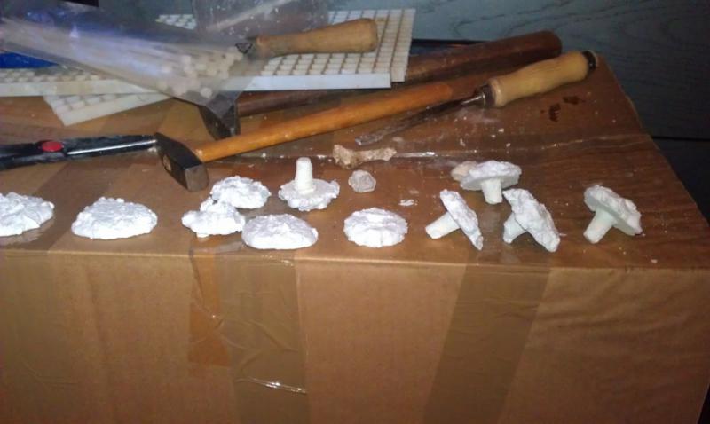 Используем тот же цемент который и для банки: белый портланд цемент без добавок.Рекомендую его делать чуть более жидким,что бы в ножку нормально затек,ну или если густой-то чем то типа ручки утрамбовать его в отверстие для ножки,и сверху уже налепить ту форму которая нужна.Твердеет очень быстро,часов через 5-6 уже застывший.