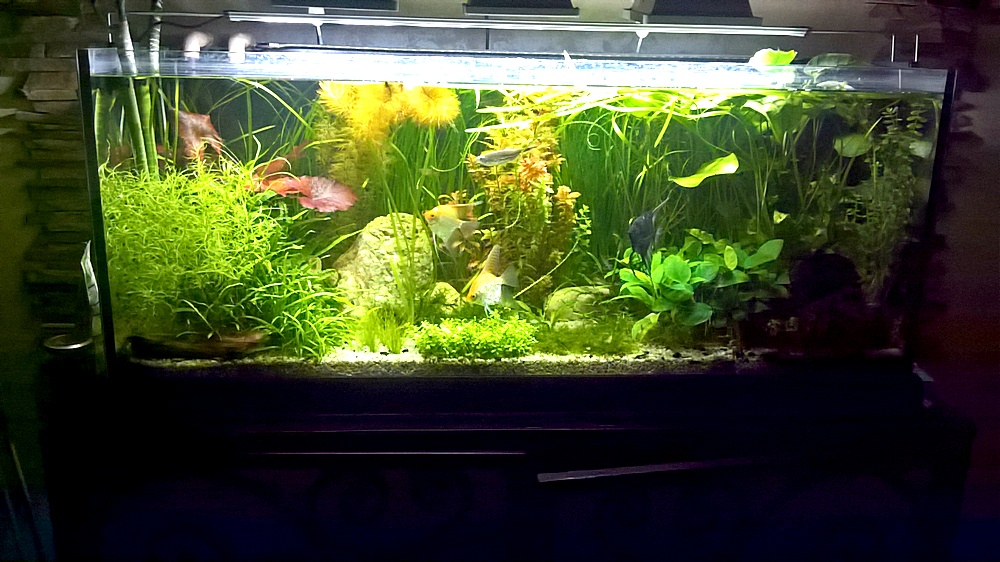 После подключения одного нового светильника аквариум выглядит так (старые уже выключены, но еще не сняты)