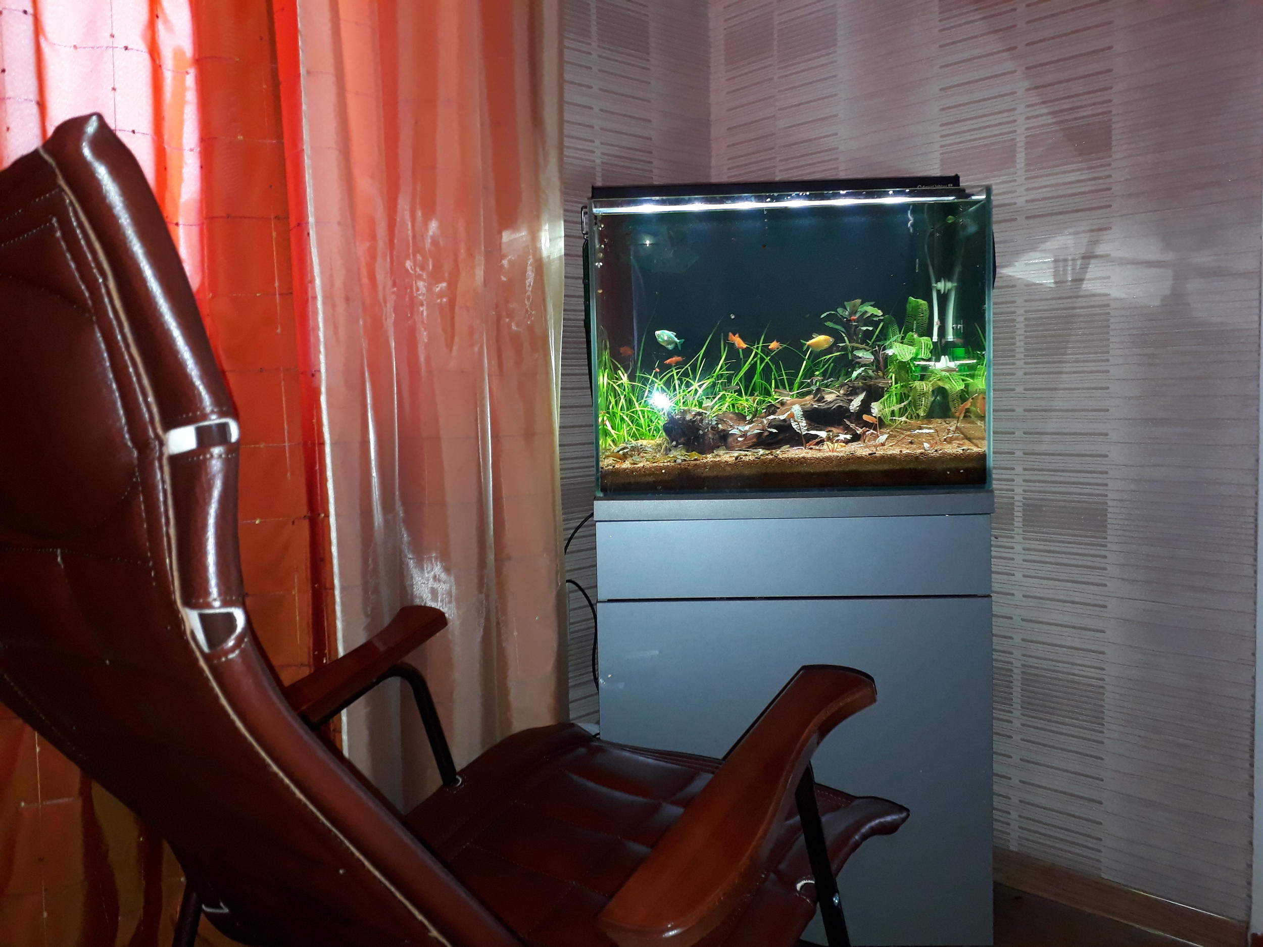 Аквариуму 5 лет. Объем 100 литров. Сфоткал вместе с креслом чтоб передать весь антураж, фото сделал как смог фотоаппарат мобильник,. В реале намного красивее. Вода 50/50 осмос / водопровод = GH4.5, CO 2 - 1 булька в 5 секунд подача CO 2 - 6 часов в день, освещение LED 12 часов в день с имитацией восхода и заката. Удобрения ptero complex pro - около 2 мл в день. Фильтрация классическая. Грунт монадо - 15 литров. Много редких растений. Рыбы, улитки, креветки. Обслуживание 1 раз в 3 недели, подмена 30-40% раз в 3 нед. Буду признателен за оценки.