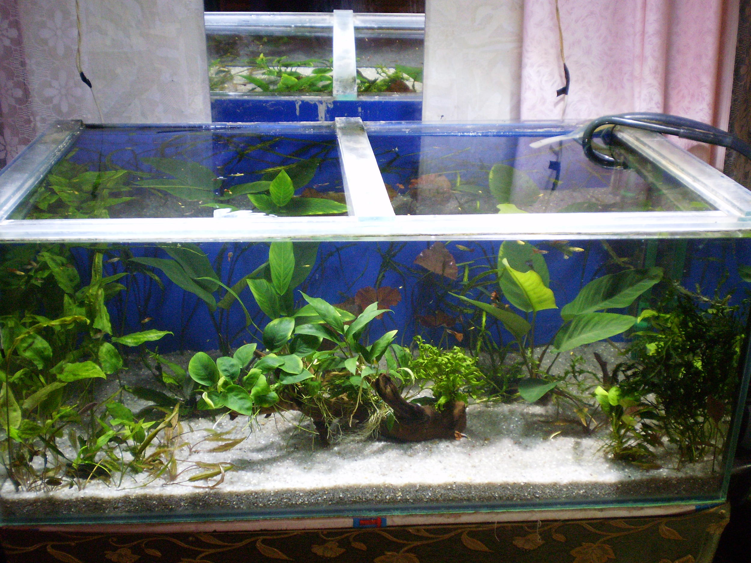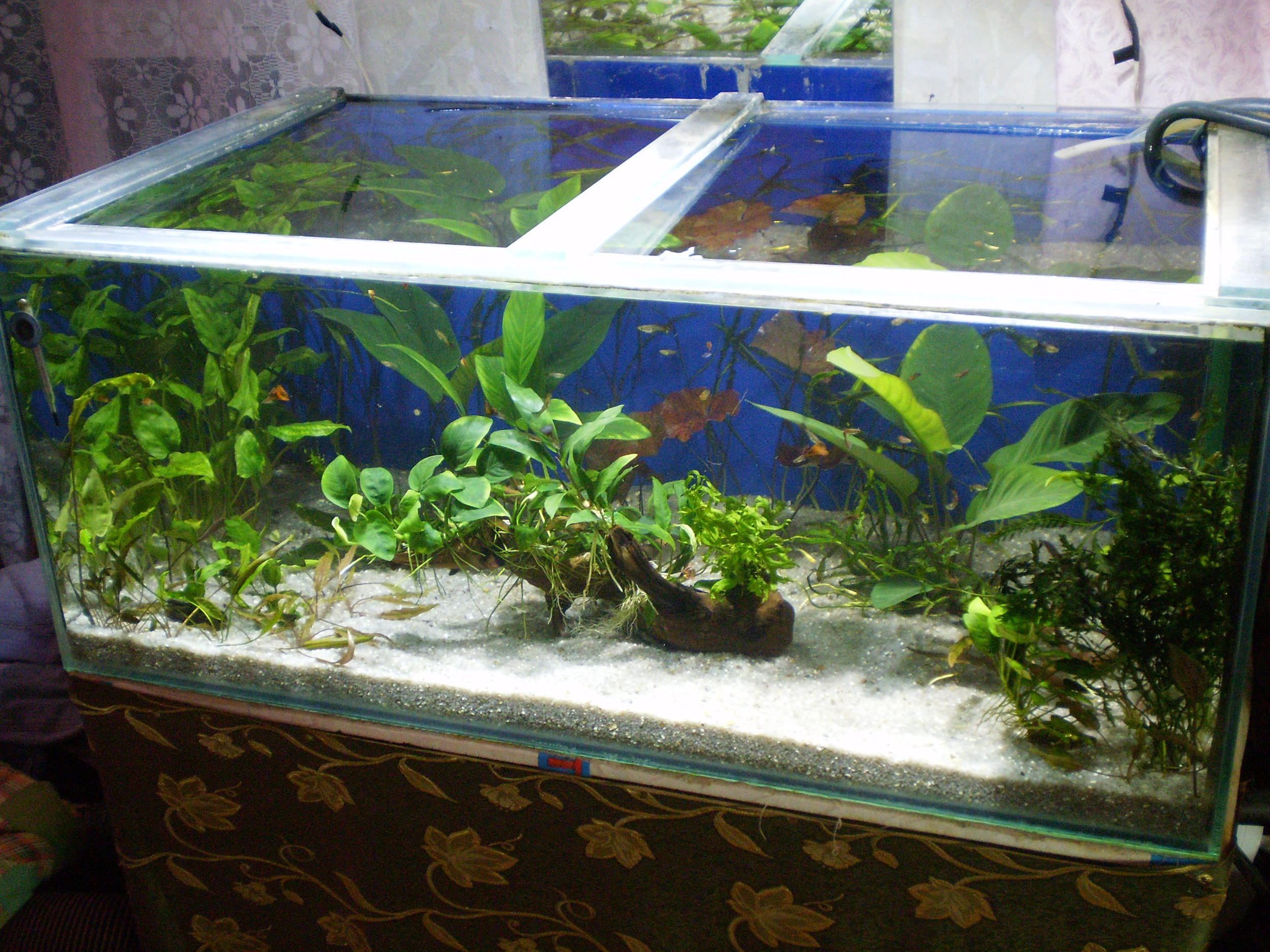 Набор растений изначально планировался из медленнорастущих:папоротники много видов,перечислять не буду,анубиасы несколько видов перекочевали из моих поллюдарумов туда,криптокорины,2 куста нимфеи, ну и т.д.Была всунута коряга с приличным куском свинца,т.к не тонула,к ней привязал анубиасы,папоротники все были примотаны на куски колотой лавы.Из рыбок как всегда-живородка,немного харацинки,коридорасы и брохисы