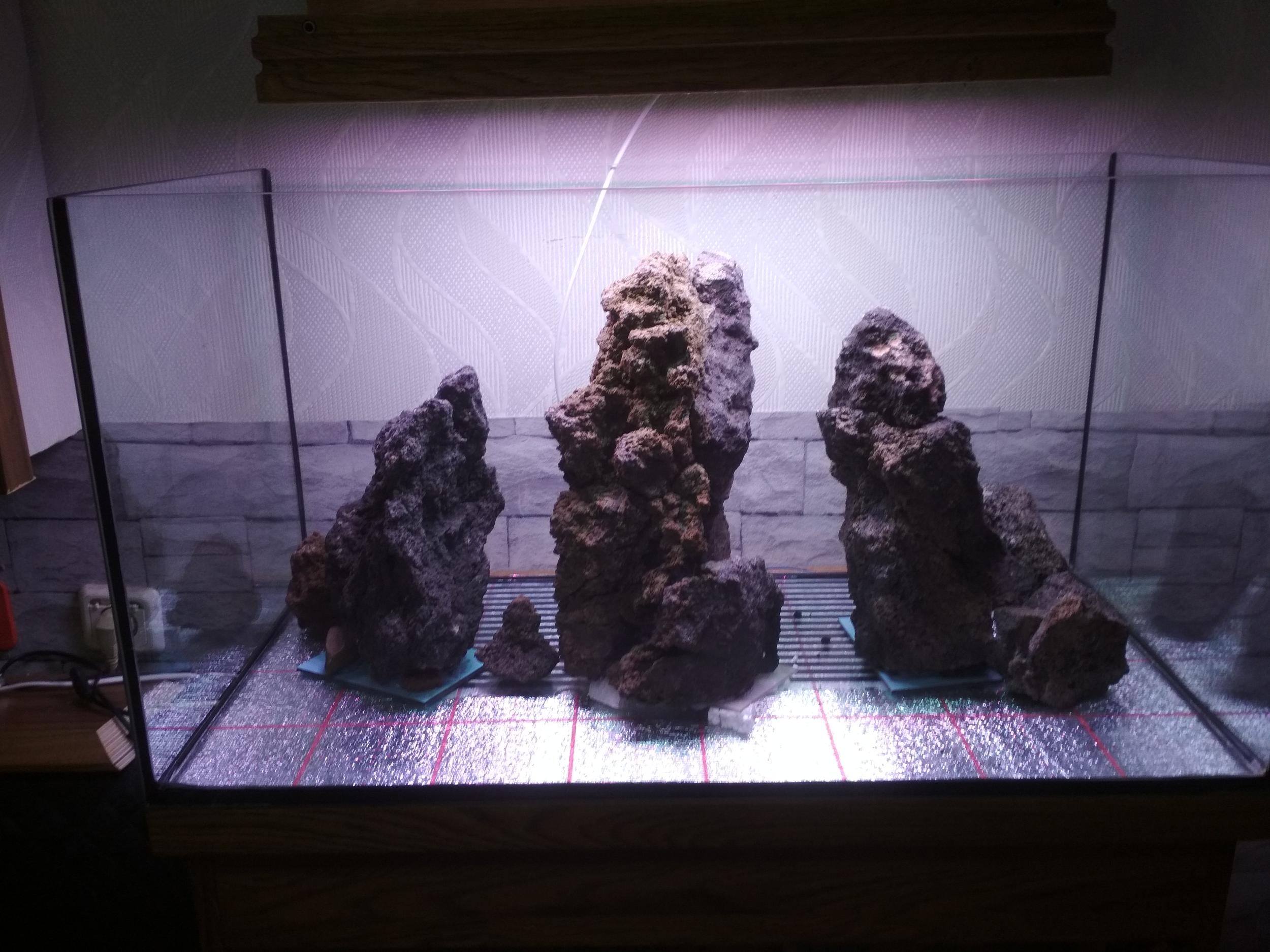 Померяв длину композиции понял что в мой аквас она не поместится. Но деньги за камни заплачены, молотком наработался как на каменоломне( не думал что лаву так тяжело разбить) Пошел искать место в квартире для нового аквариума. С размерами определился, заказал в мастерской аквас.