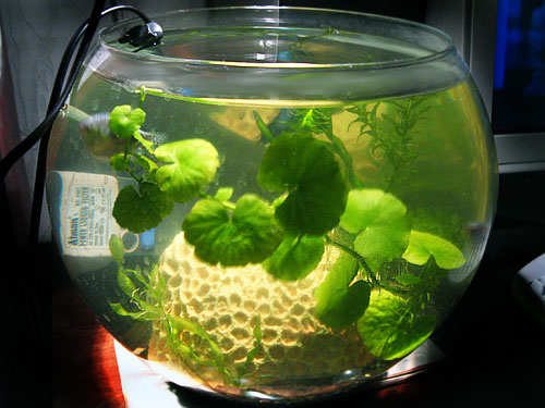 Шарик : не грунта (как я заметил), а стоит какой-то "шар". Идея интересная и необычная, но вот валлиснерия, которую придавили шаром, рости нормально не будет. Не помешало бы накрыть аквариум покровным стеклом (только или с дырочками, или оставить небольшие щели, чтобы Ваши рыбки могли получать воздух), а то лабиринтовые прыгучие