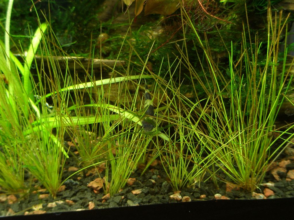 фильтр... ну в таком объёме ничего не спрячешь да и брала что дома валялось. дома в креветочнике 30 литров внешник стоит - так и от него трубки дай бог. Ну ничего - хемиантус освоится - закроет.
