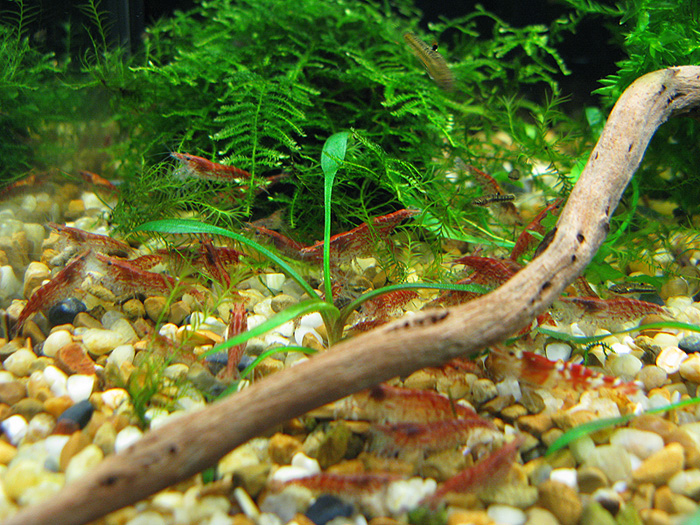 Ставридка, а мои не прячутся от рыбсов! Их побольшему счету вообще невидать и выползают только при кормежке. Кстити креветки особенно те что побольше гоняют мальков молли и мечиков, хотя "там" есть и довольно крупные мальки! И едят нахально перед "носом" у рыбс и еще пытаються отогнать или стащить кусок!