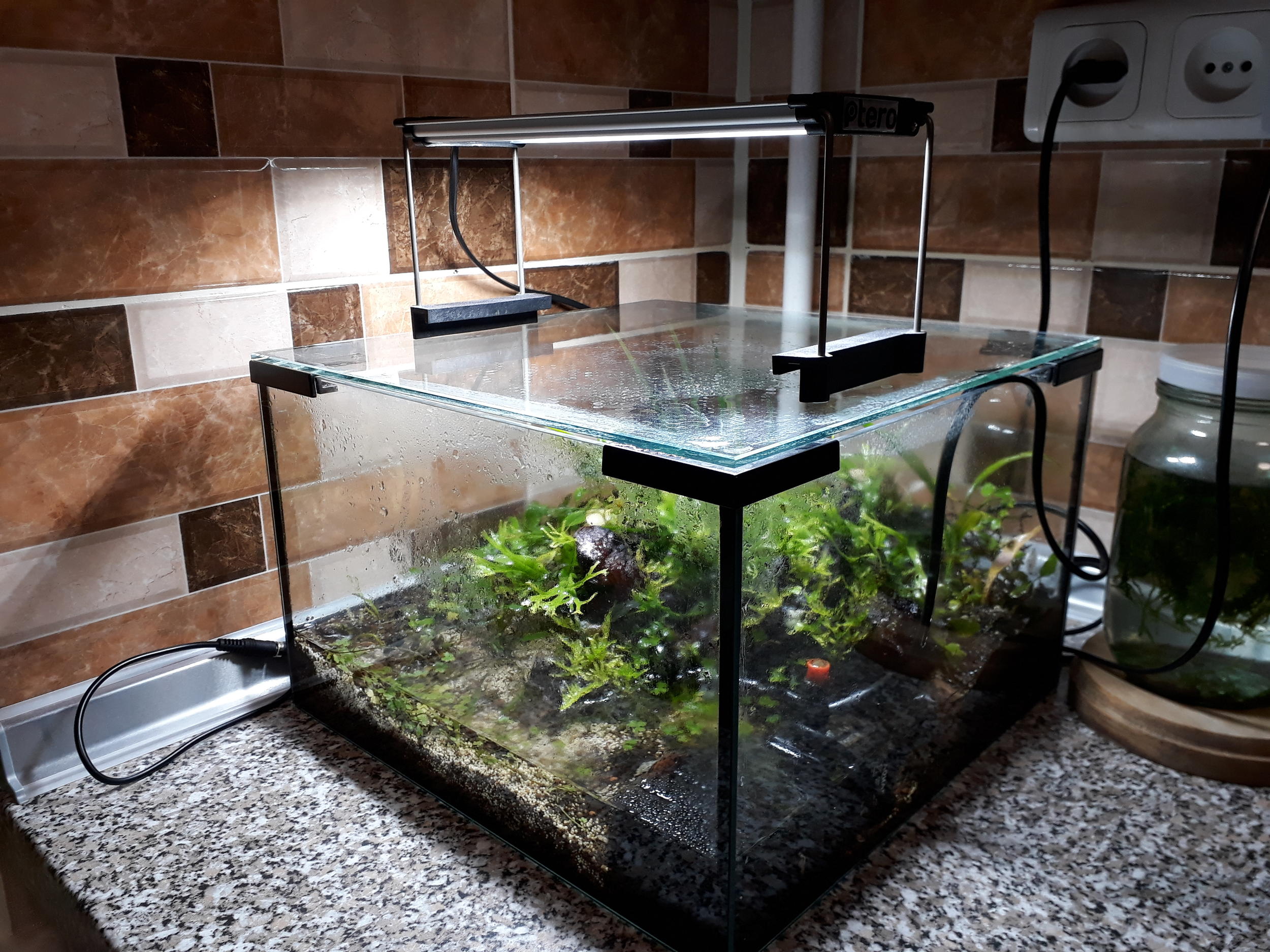 Сверху есть щели, обеспечивающие небольшую циркуляцию воздуха. Фильтр-фонтанчик раньше работал безостановочно, но на растениях начал образовываться водорослевой налет от чрезмерной влажности. Поэтому установил реле-розетку, и до недавнего времени фонтанчик включался каждый час на 15 мин. Все равно показалось, что влага в избытке, т.е. листья растений постоянно были мокрыми, поэтому сейчас установил, чтобы он работал 15 мин. после 75 мин. перерыва (и так круглосуточно).