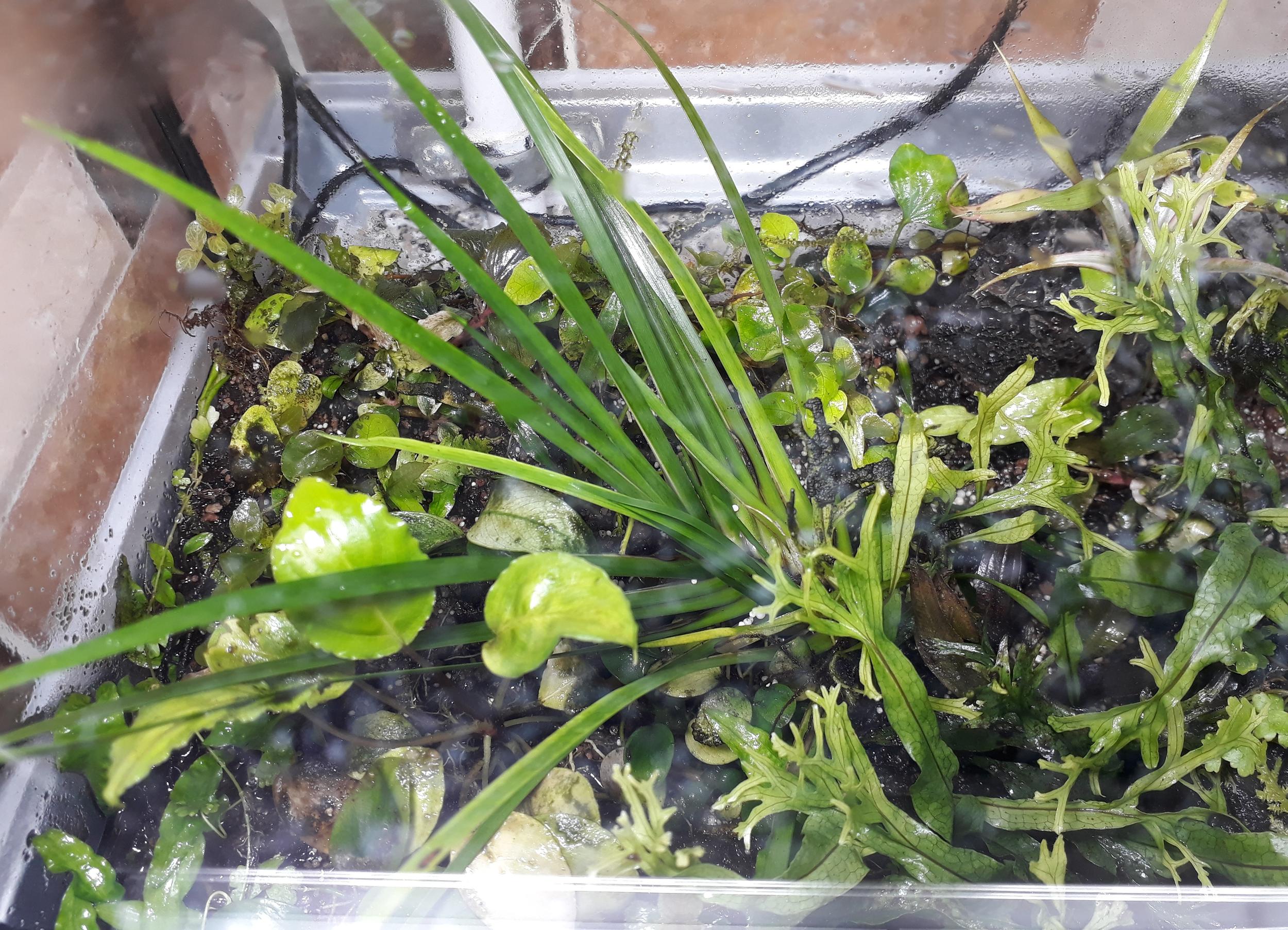 На фото – «нано-палюдариум» 30 × 30 × 20 см. Есть водная часть и преобладающая «полуводная». Но все растения находятся над водой, погружены лишь корни (и небольшая прикорневая часть, у тех, что ближе к фильтру).