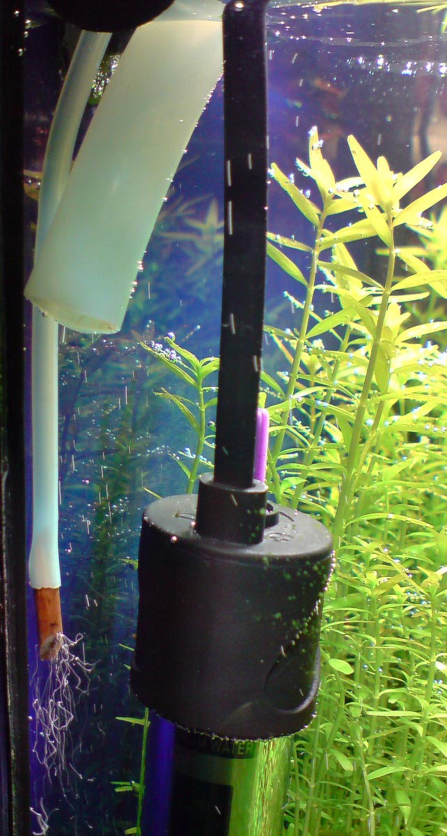 - пробовал на выхлоп разные насадки, губки и т.п. - либо течение сильное, либо бурун на поверхности, который вымывает СО2, либо резкое снижение производительности.
