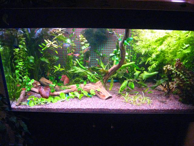 За качество извиняюсь. По задней стенке - поляна для яванского мха, он по всему пириметру снизу "навязан". Живут макропод черный (самец+2 самки), макропод обыкновенный (самец+2 самки), миноры 10шт, Sea - 2, гиринохейлиус, ,бычки-пчелки - 4, петухи (самец + самка), молли-баллон - пара, боция клуон - 2, неокардины, нотобранхиусы - 2 самца и самка.