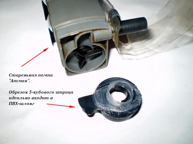 У кого есть голова с переходниками – тому повезло. Мне не повезло. Я не унывал. Снял крышку, закрывающую импеллер, взял 5 кубовый шприц, отрезал от него верхнюю часть длиной ок 7 мм, и, вооружившись растворителем и суперклеем, соединил эти части в единое целое. Минут через 10 замазал "швы" силиконом (дабы минимизировать проникновение клея в воду, но это не обязательно) – и на батарею сушиться. Судя по скорости работ в акве на часа 2 как минимум. Результат смотрим на фото.