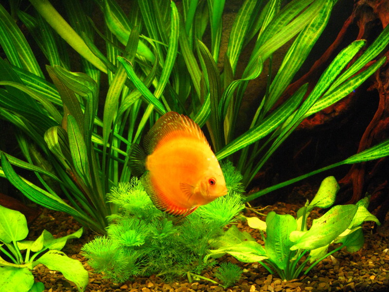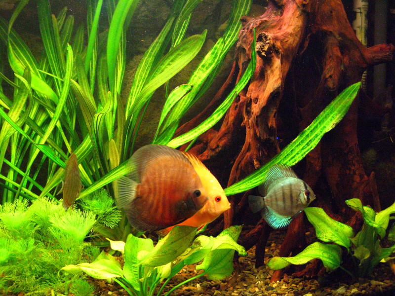 Обозвал его в теме "аквариум с дискусами", но там плавают не только они. Еще пара апистограм, небольших плекостомусов, агамиксов, по одному анцитрусу двух разных видов, акантафтальмиусов немеряно, пара лисичек, крапчатые сомики и водорослеед (sae). И семь дискусов, (еще малодые совсем).