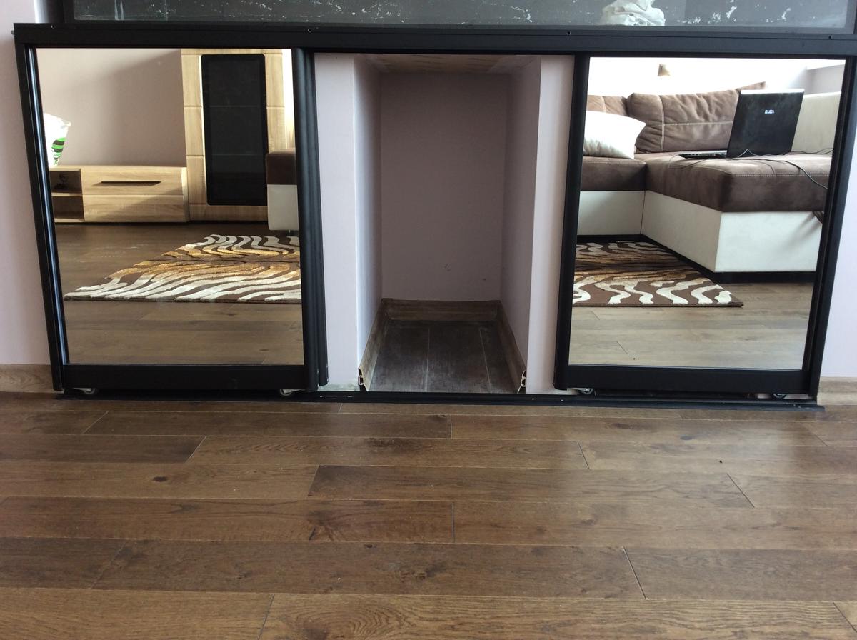 Единственная сложностью было придать этой каменной тумбочке пристойный вид снаружи, закрыть вид будущих фильтров и другого оборудования.После долгих поисков и размышлений была установлена раздвижная система из алюминия и стекла, как в стандартных шкафах купе. Очень удобно, не боится влаги и заказать можно на любом рынке у торгующих шкафами купе в любом цвете и с любым рисунком, или просто с зеркалом как у меня ( самый бюджетный вариант). Смонтировать ее на месте легко, у меня аква и столешница одной ширины, поэтому я крепил верхнею направляющею к боку столешницы, просверлил в ней сбоку сквозные дырки и закрутил саморезами в передний торец столешницы.