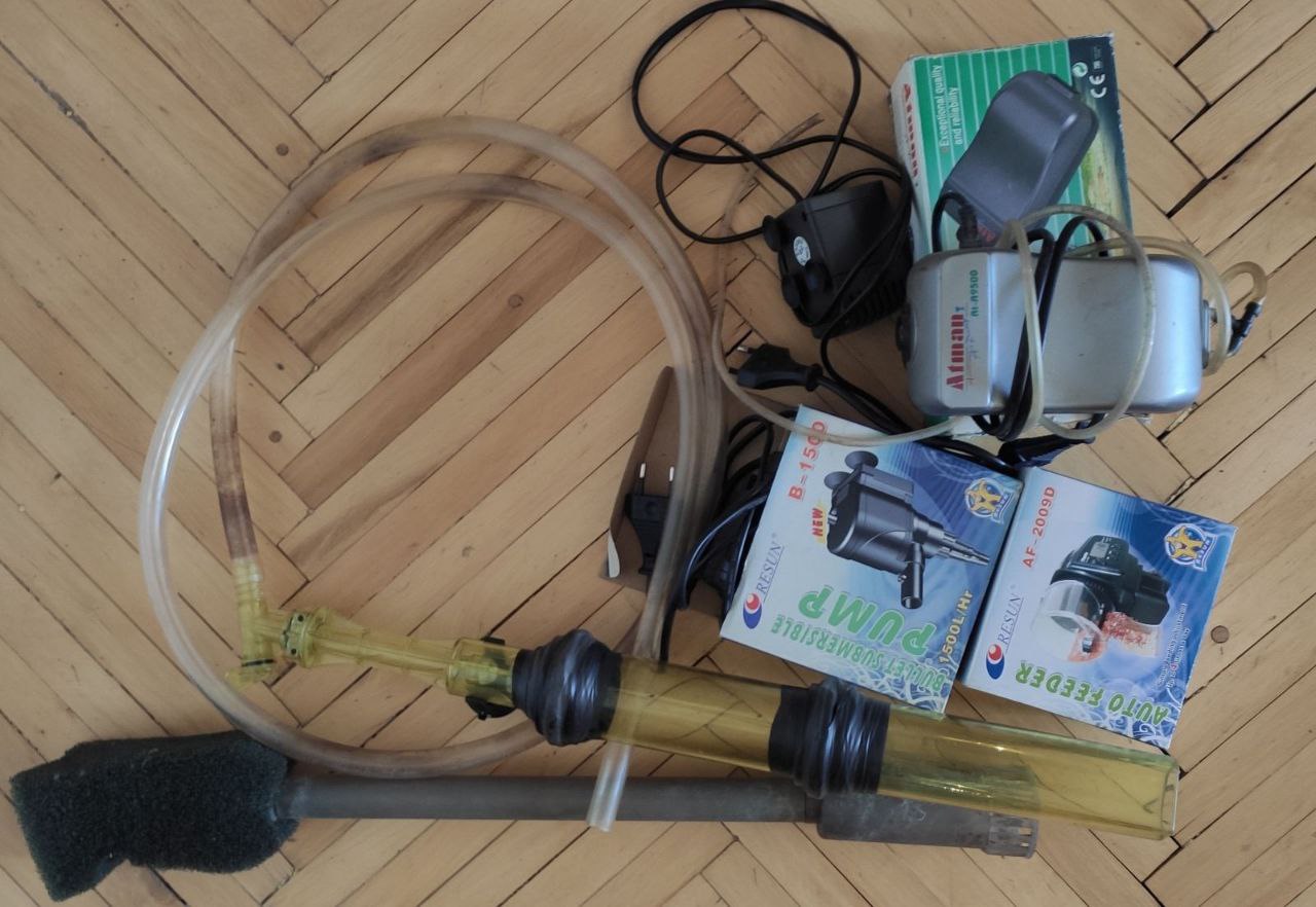 4. пара помп(атман 202+ resun 1500, ножиці, грунтоочисник, термометри, автоматична годівниця Resun AF-2009D і т.і.