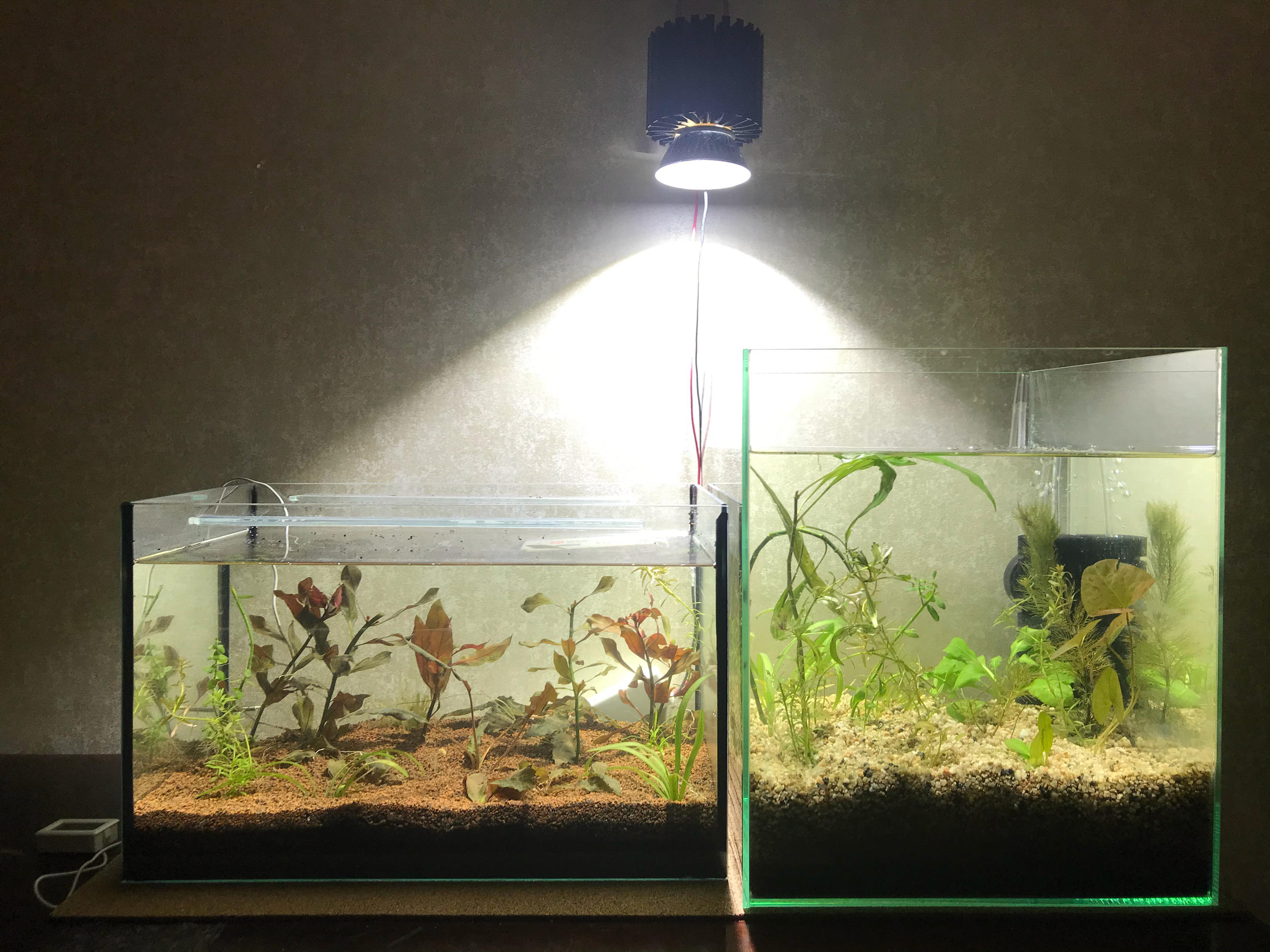 После запуска в обоих аквариумах было высокое содержадие азота и фосфора. Вырос и pH c водопроводных 8 до 8.5