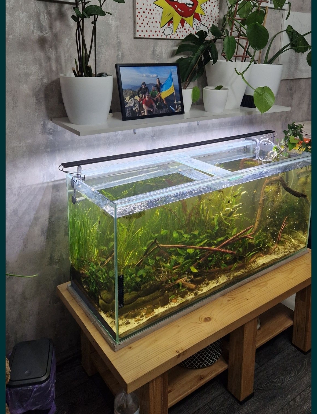 Продам акваріум на 220л наповнення води. Розмір Ш 111см В 50см Г 50см Внизу є кран для зливу - використовувався для донної фільтрації. В комплекті: 1. Фільтр зовнішній на 200+літрів. 2. Декілька коряг та водорості ( анубіас, валіснерія, лимонник, папоротники та ін. рослини) 3. Лампа 4. Обігрівач 5. Грунт Акваріум вже переїзжав декілька разів іі чудово працює. Не тече, радує очі. Причина продажу - немає часу на улюблене хоббі. Окремо можемо обговорити продаж столу під акваріум ( зроблений з брусу та столешні з натурального дерева своїми руками, укріплений металевими кутами та полицею. Доставка неможлива. Тільки самовивіз. Ціна за все + багато доп (коряги, грунт, бу фільтри та нагрівачі) - 9000грн
