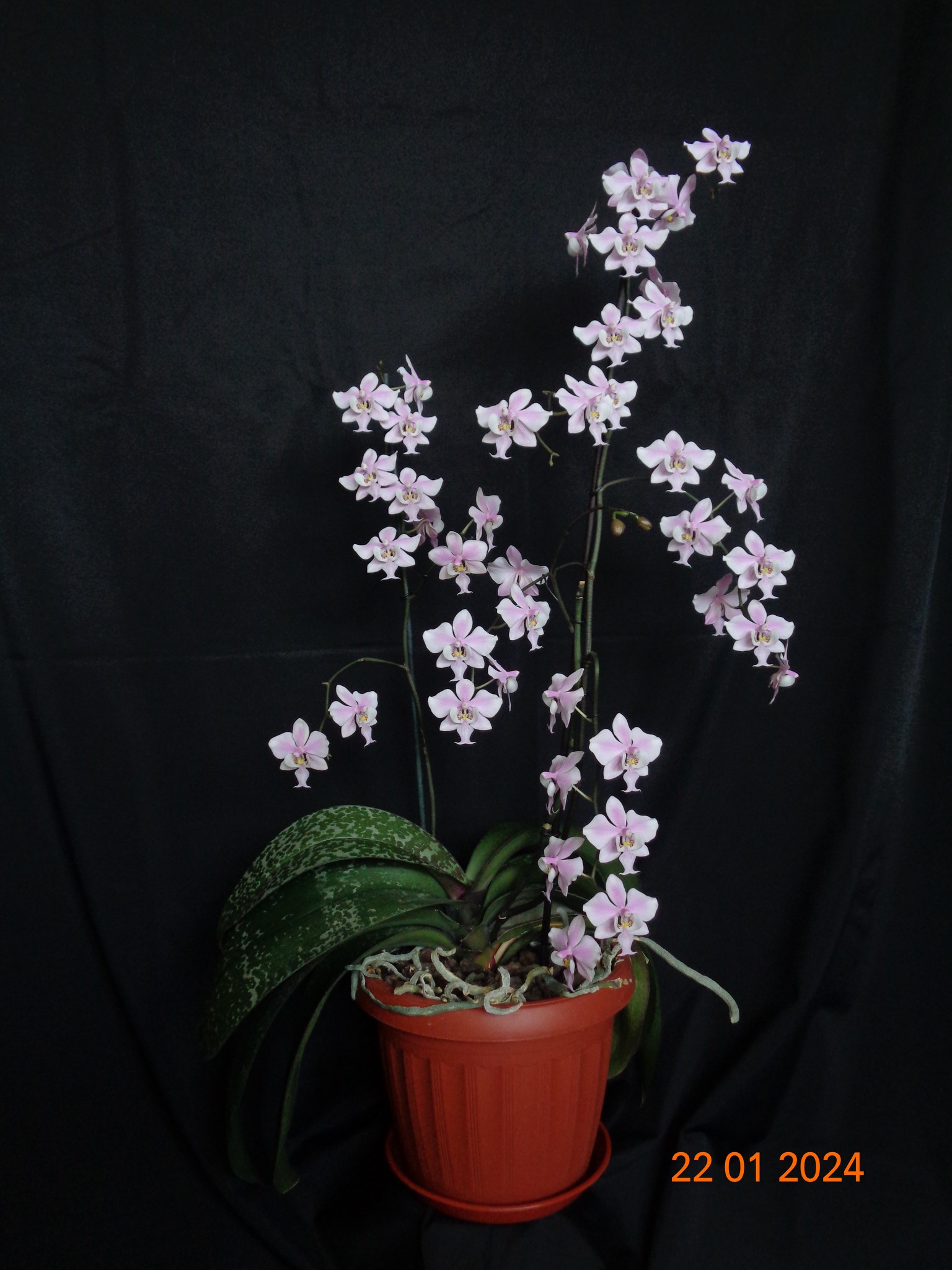 Phalaenopsis schilleriana природный вид. фото 22-23 перевалка в горшок на 5,5 литра. фото 49-54 Чергове цвітіння мого Phalaenopsis schilleriana 73 квітки. Горщик на 5,5 літрів. 9 листків. Листки під 40 см.