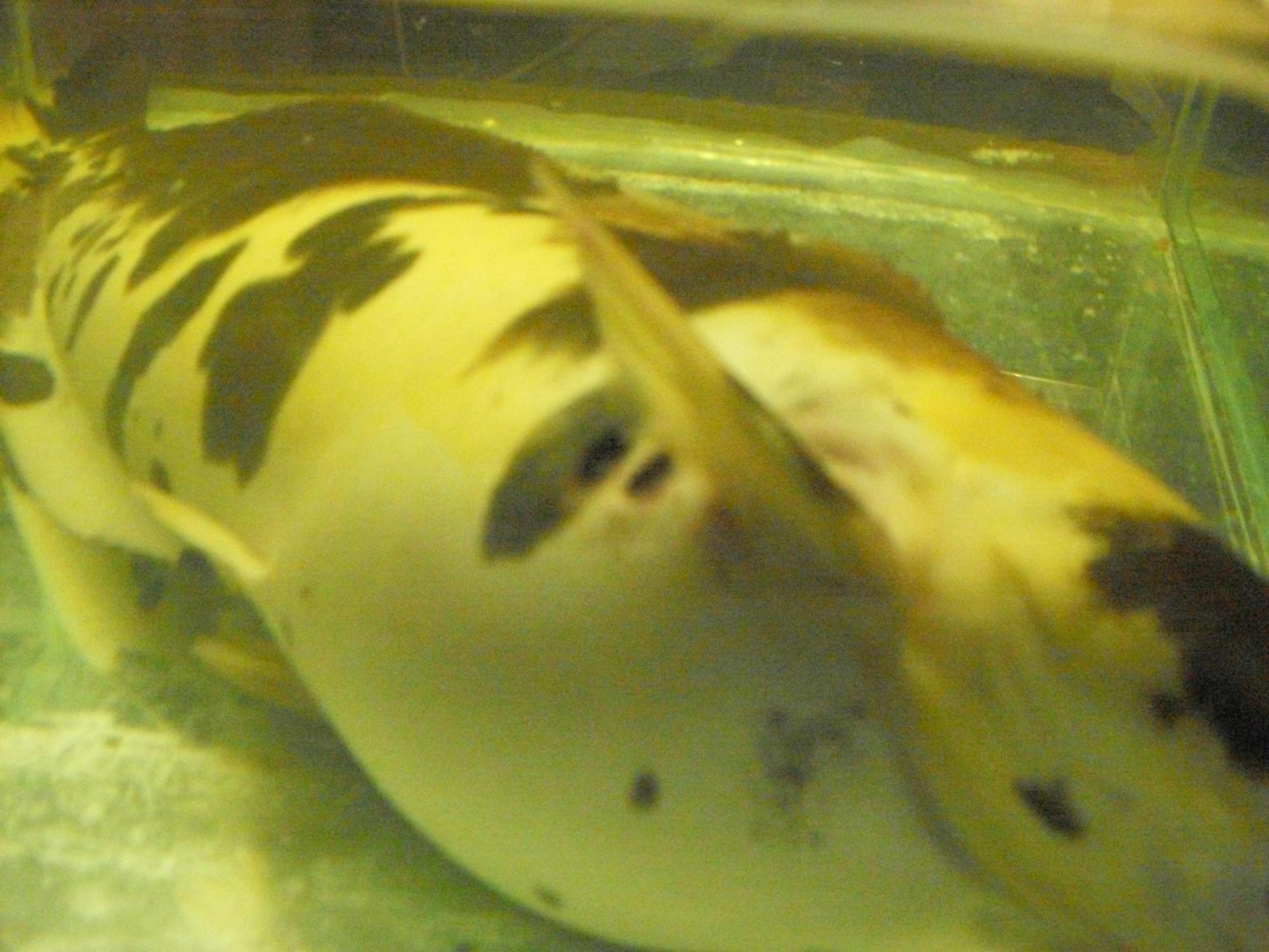 за плавником и над плавником опухоль. в банке с клариусом живут