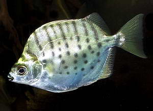 Точное название не помню, но это рыба так называемых солоноватых вод, как аргус. Рекомендуется по мере роста рыбы подсаливать воду. Должен любить растительную пищу. Рыба, к стати, стайная. Вырастает см 30.