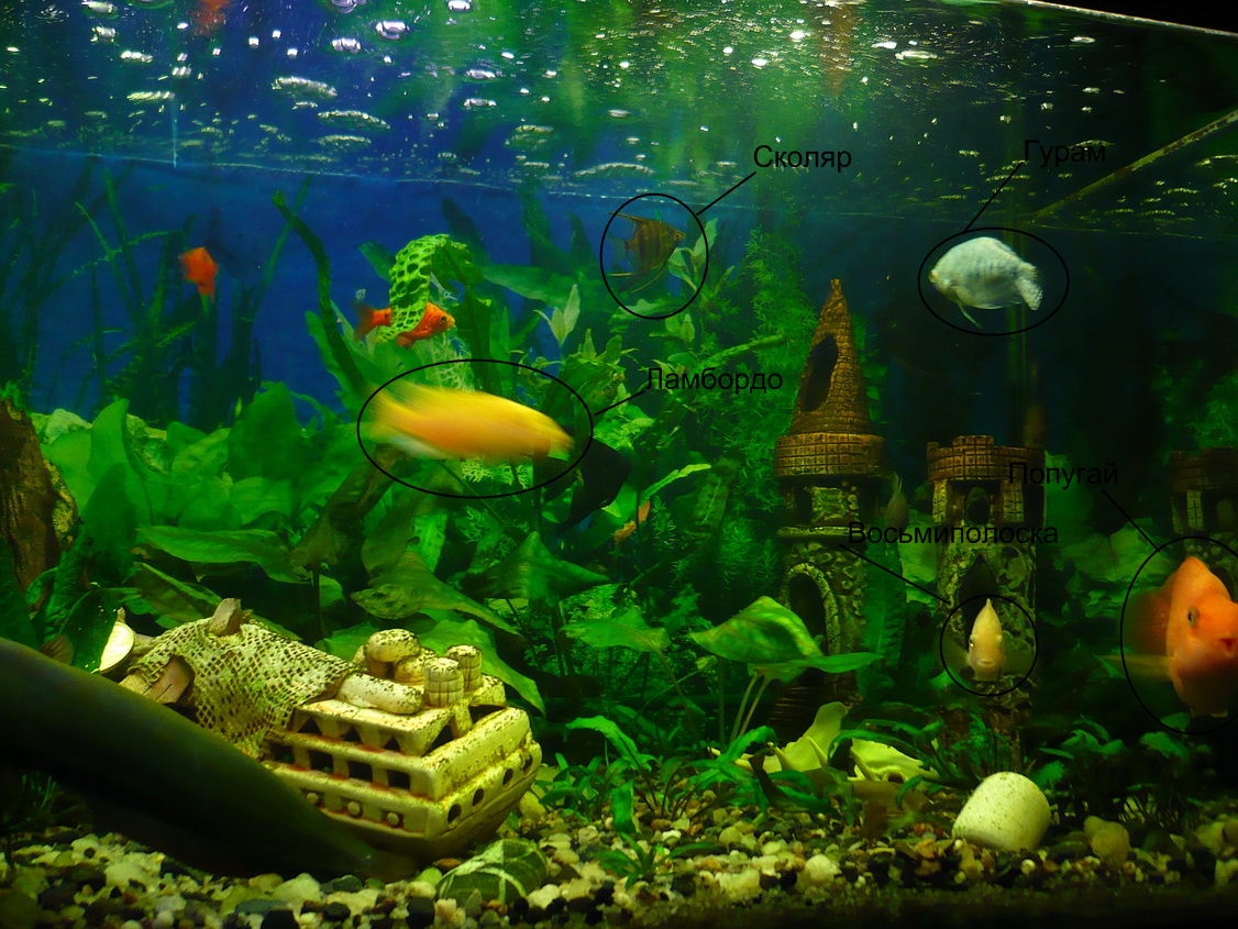 У меня в 200 литрах отлично уживаются гурами мраморный, жемчужный, пара ламбордо, пара попугайчиков, пара меланохромис Йохансона, пара восьмиполосик, пара ктенопом леопардовых, елоу и дельфин.