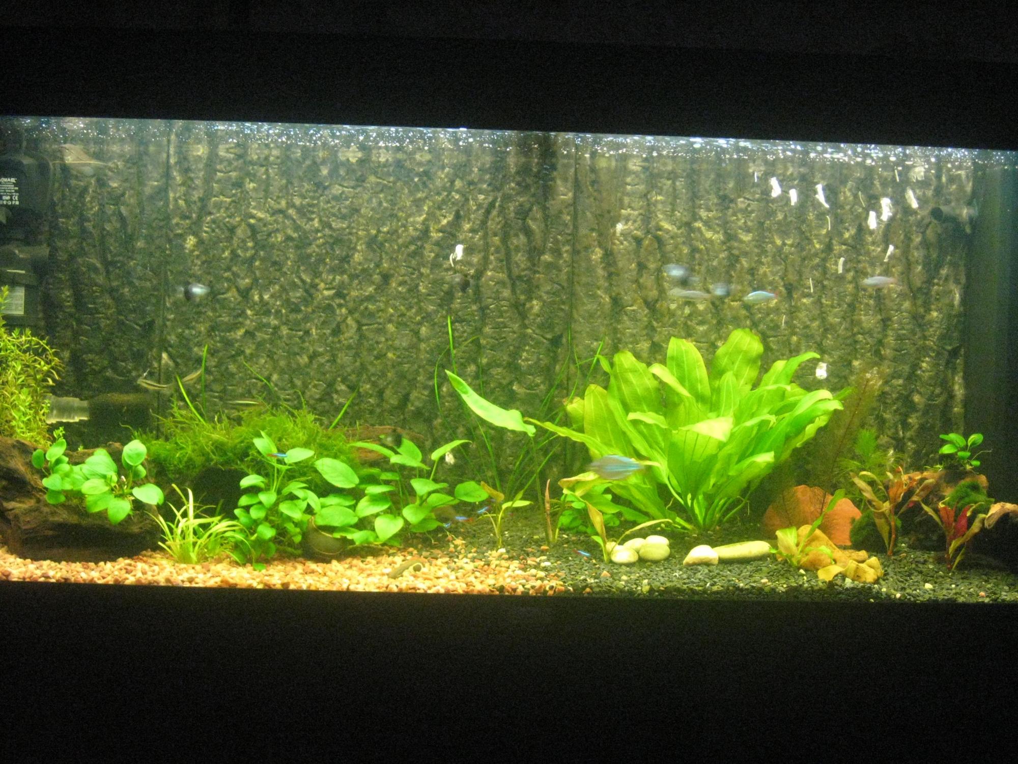 я бы ещё закрыл каким то длинным растением место стыков фона,например валиснерией или гигрофилой иволистной и т.д.