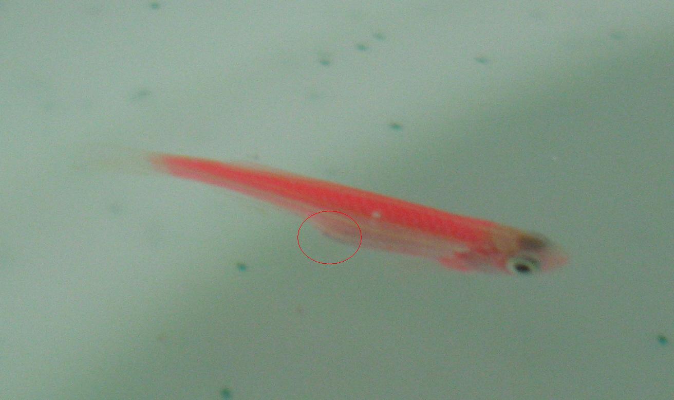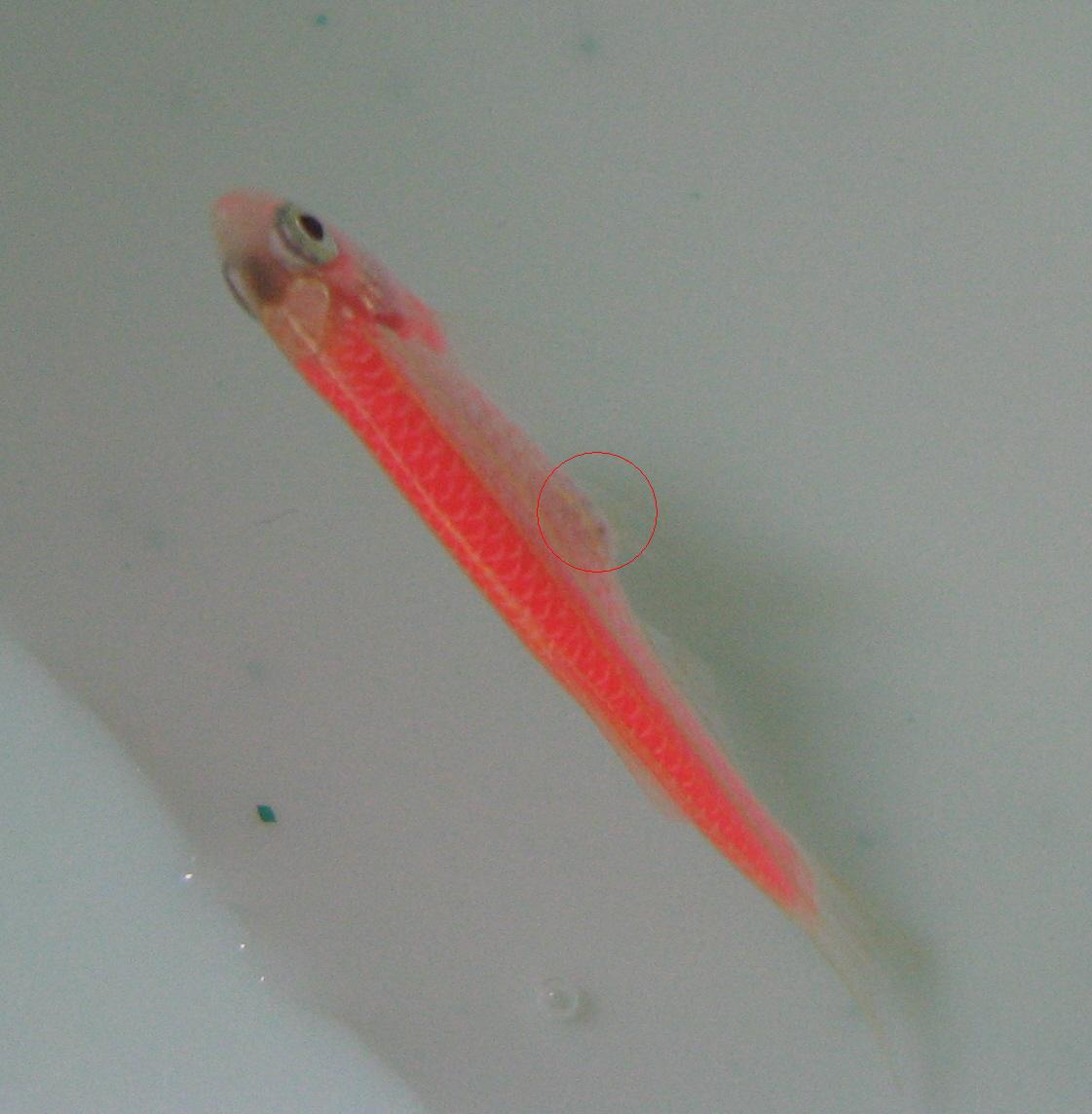 Заметил на второй день после того как принес, может и был с самого начала. Других отклонений я не заметил. Активная рыбка, плавает нормально, не заваливается, ест, какает... Не знаю может на что-то конкретное обратить внимание..