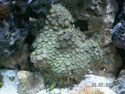 Синулярия, на втором фото результат неудачных попыток закрепить отрезаную ветку. Суперклеем не получилось - под водой ни как, рифконструктор не взял на себя это дело, а вот обычной резинкой - легко, её видно на третьем фото. Через две недели резинку сняли - прирос отлично и не плохо себя чувствует, на маточном кусте сейчас и не видно где был срез. На втором фото, на крошке, рыжие пятна это планария, где-то удачно подцепили эту гадость и она раздражала почти неделю - были дни когда она залепливала почти пятую часть смотрового стекла, только почистишь - на второй день тоже самое. После третьей поставки живности её количество резко уменьшилось, может кто начал есть её, может и нет, но сейчас её очень мало и в основном только на каулерпе перистой.